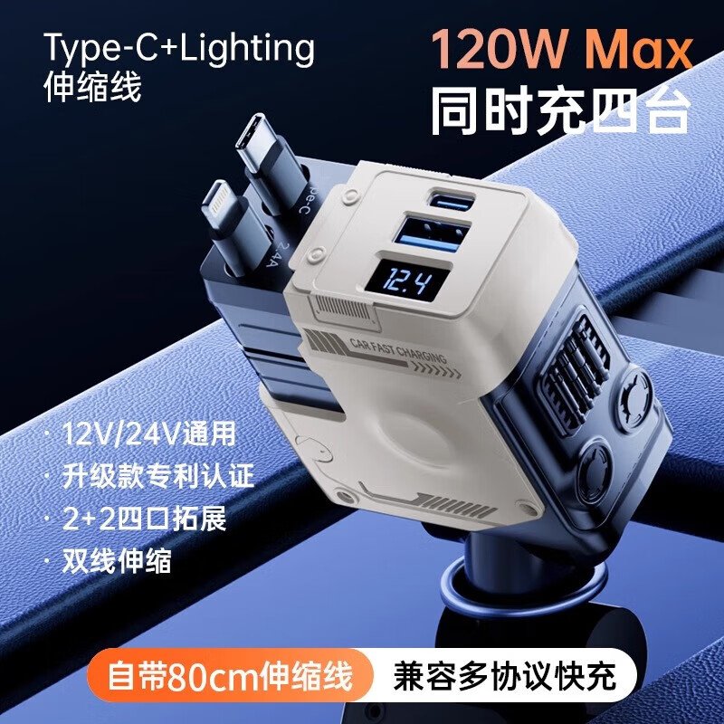 차량용 충전기 슈퍼 급속 플래시 충전 120W 4in1 신축선 [애플+타입-C포트]