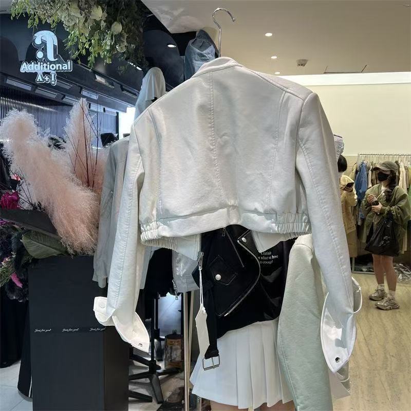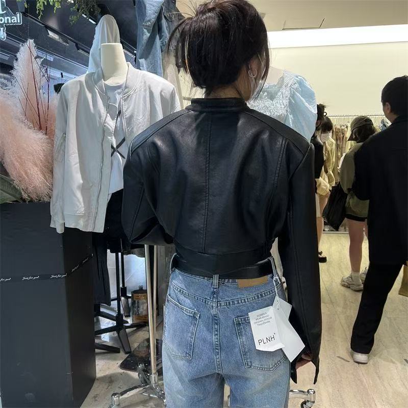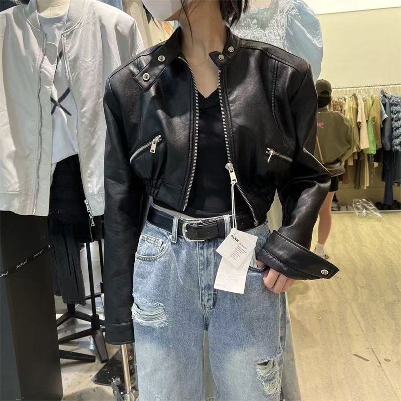 2025 가을 새로운 레트로 항구 바람 스탠드 칼라 PU 가죽 지퍼 긴팔 재킷 오토바이 바람 가죽 재킷 짧은 여성 코트