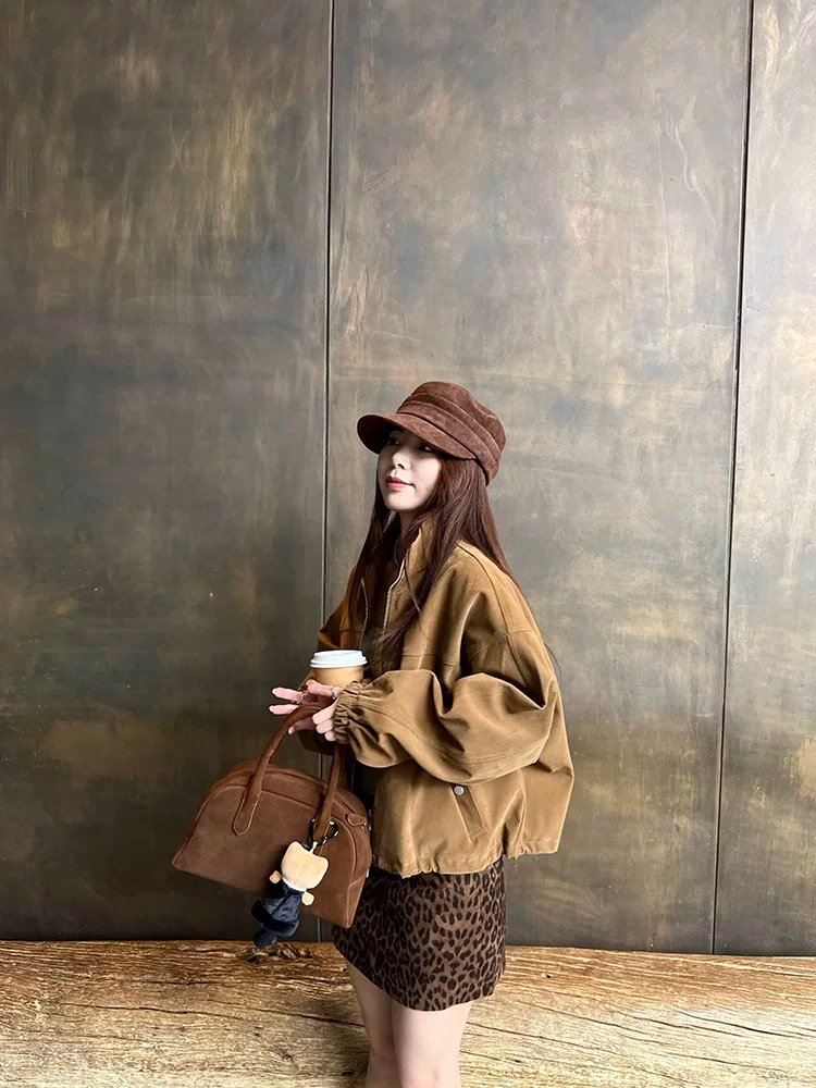 아름다움 라드. 디자인 센스 레트로 스타일 커피 색상 스탠드 칼라 스웨이드 짧은 여성 코트 가을 겨울 느슨함 센스 프로필 모양 재킷 맨위