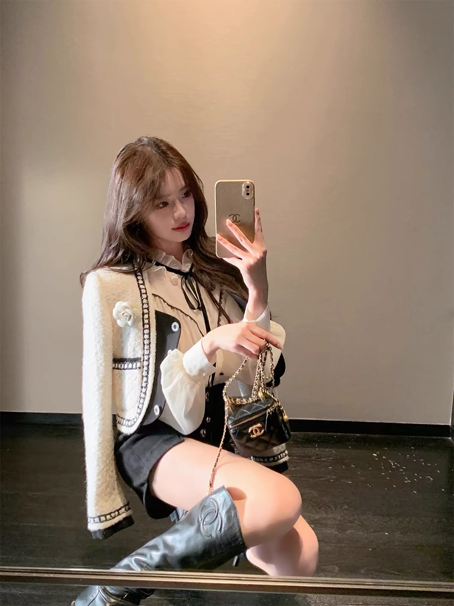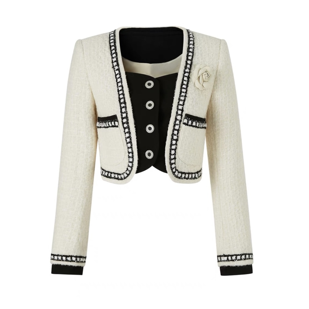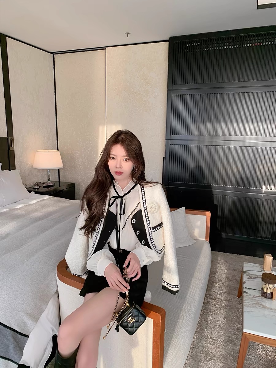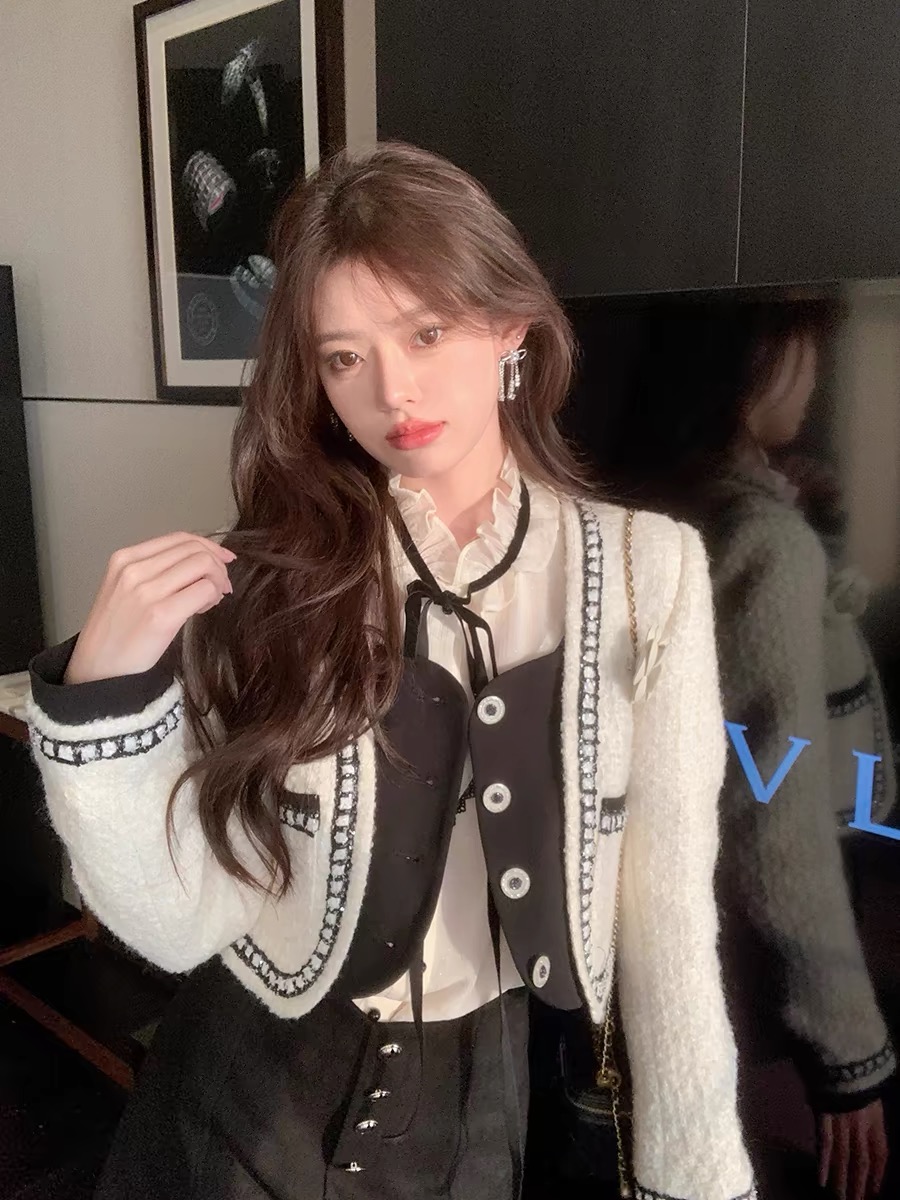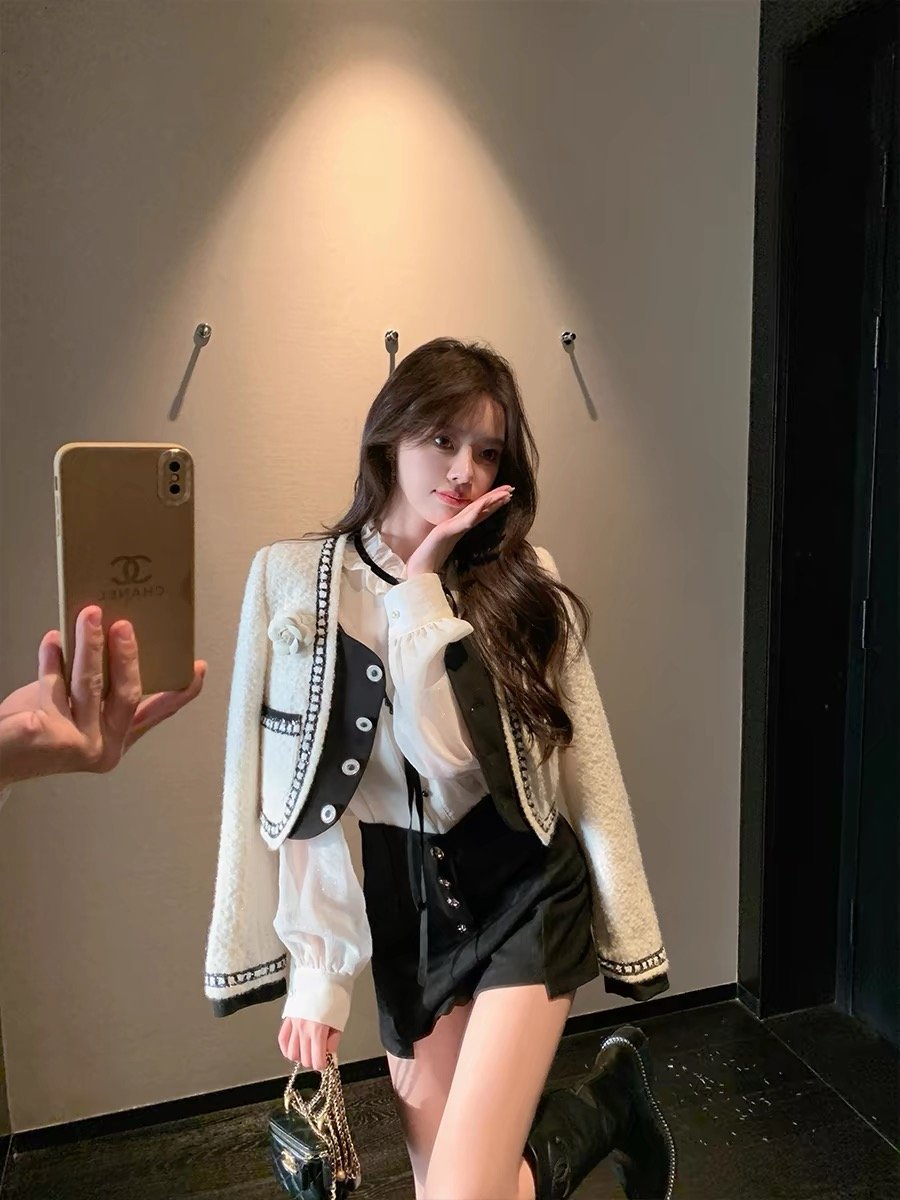작은 샤넬 스타일 짧은 외투 이른 가을 새로운 여성 의류 검정색 체크무늬 여성 코트 루즈핏 긴팔 라운드 넥 쇼트 스타일 맨위 여성