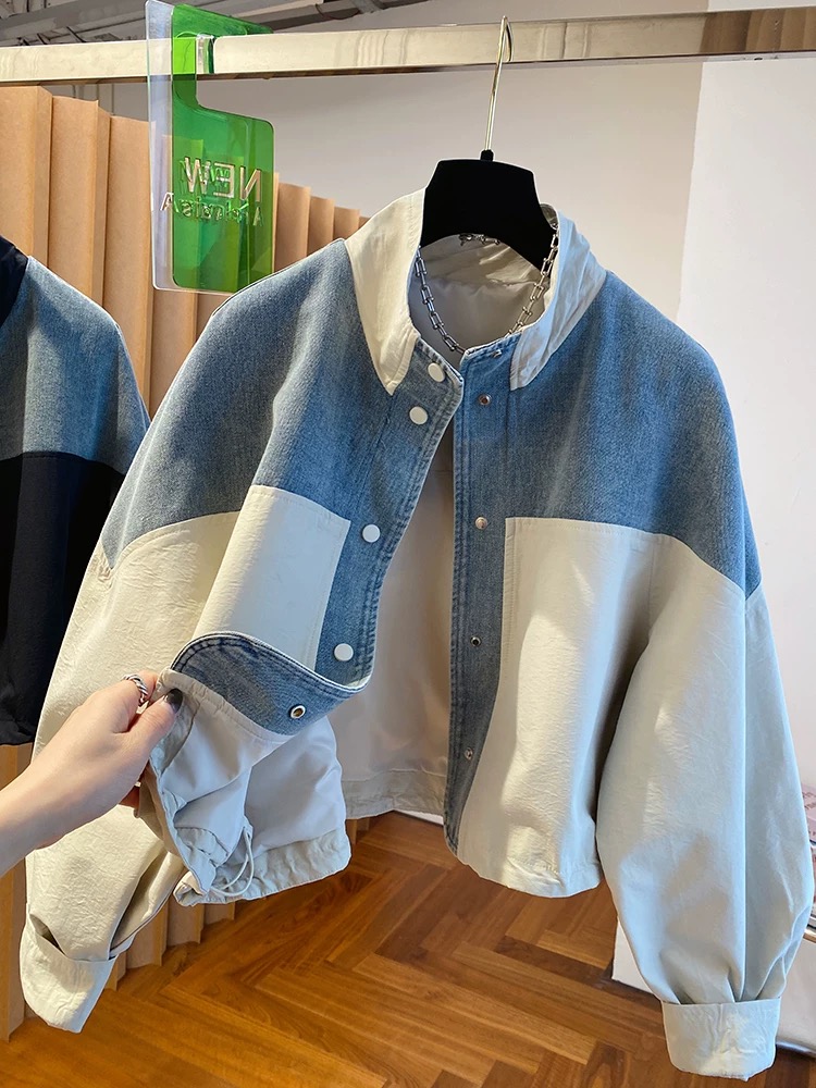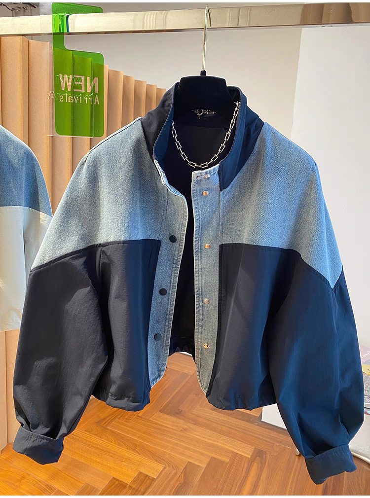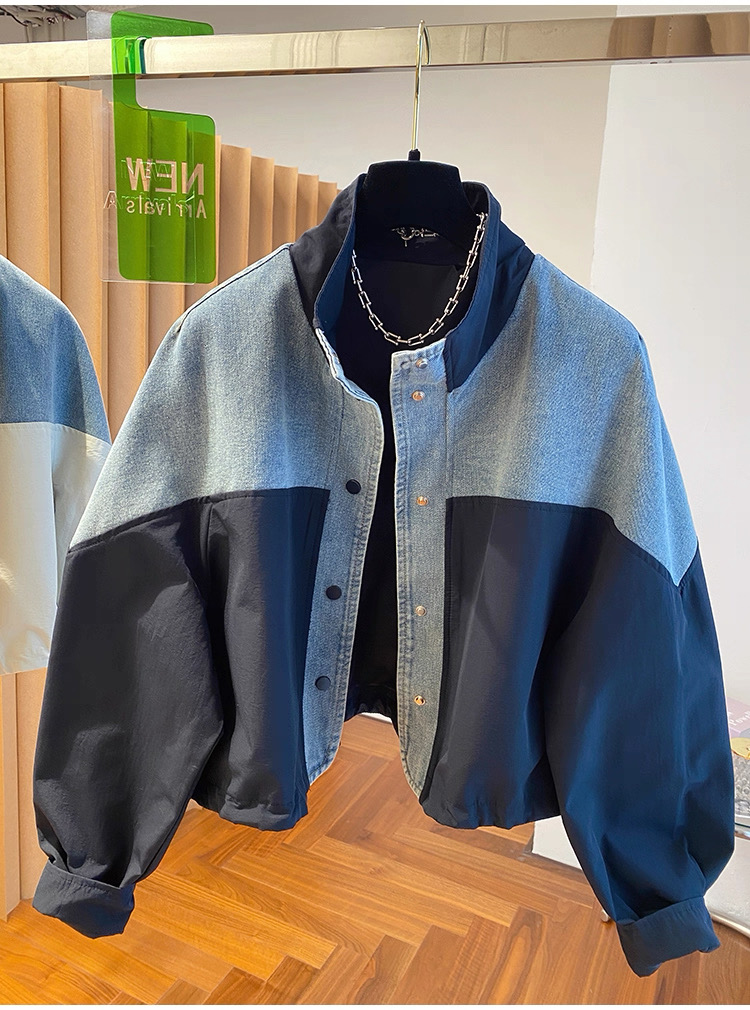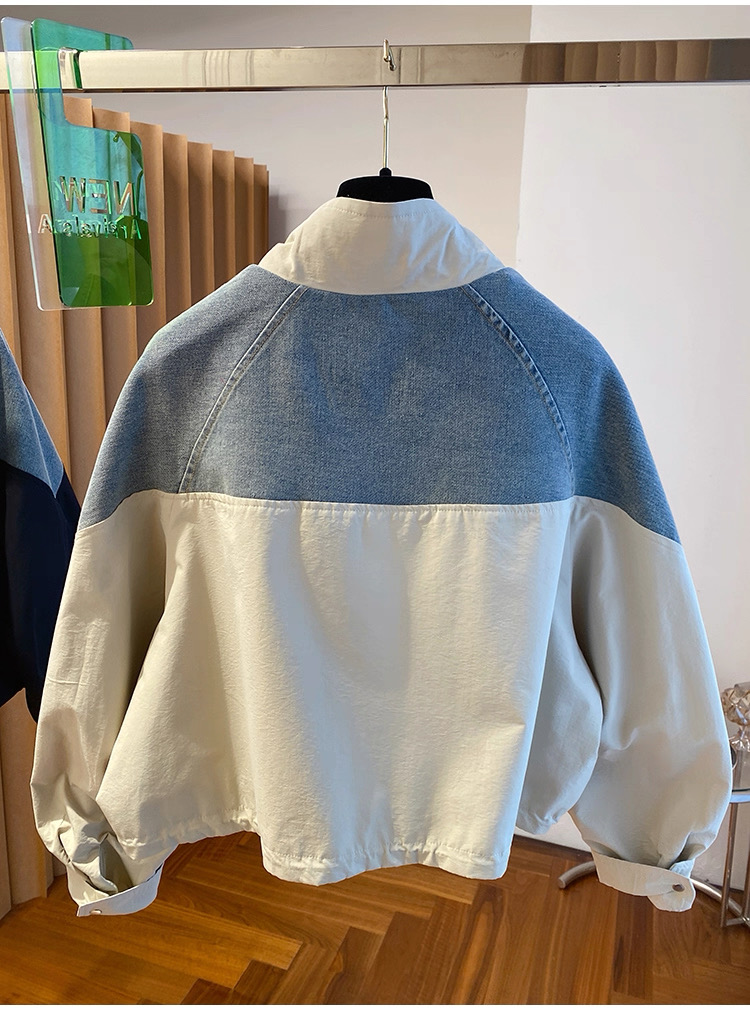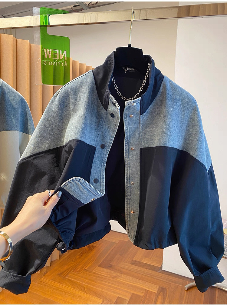 유럽 상품 데님 패치워크 스탠드 칼라 여성 코트 2025 가을 새로운 루즈핏 캐주얼 다용도 쇼트 스타일 재킷 맨위