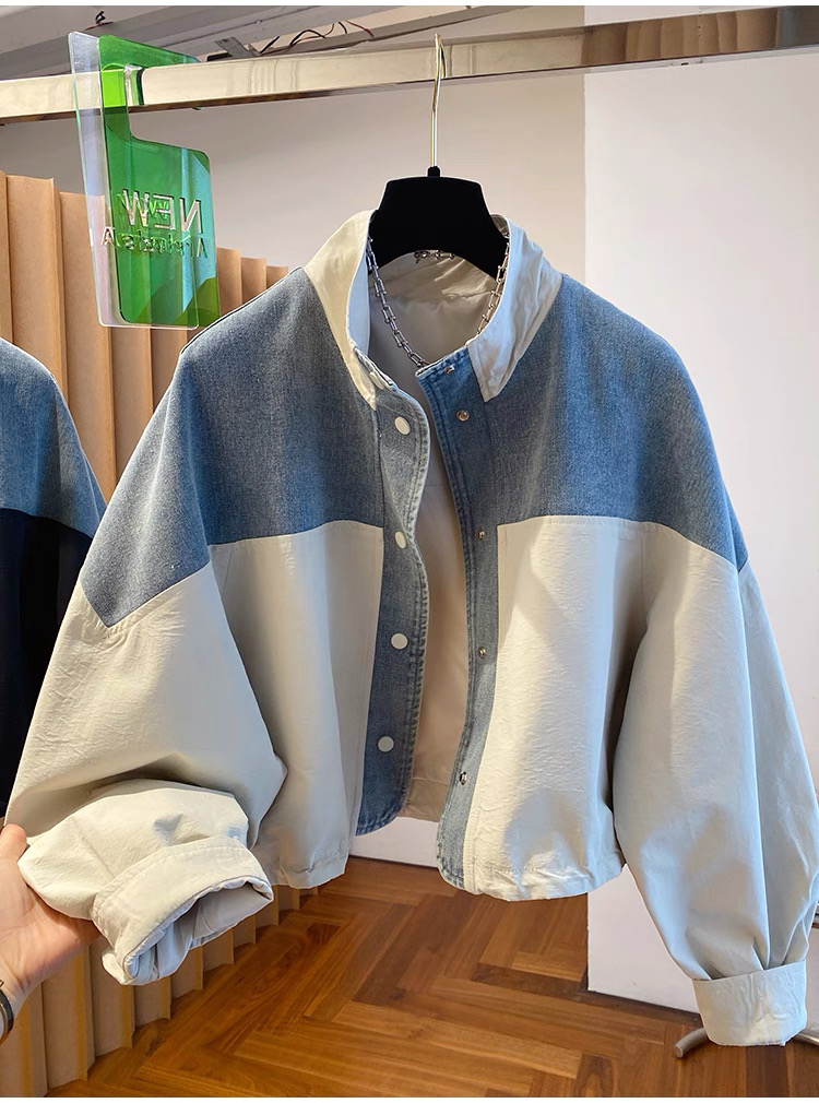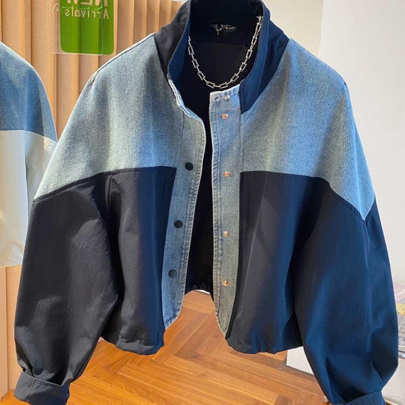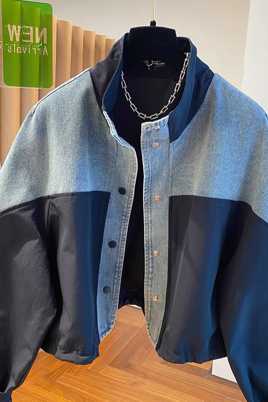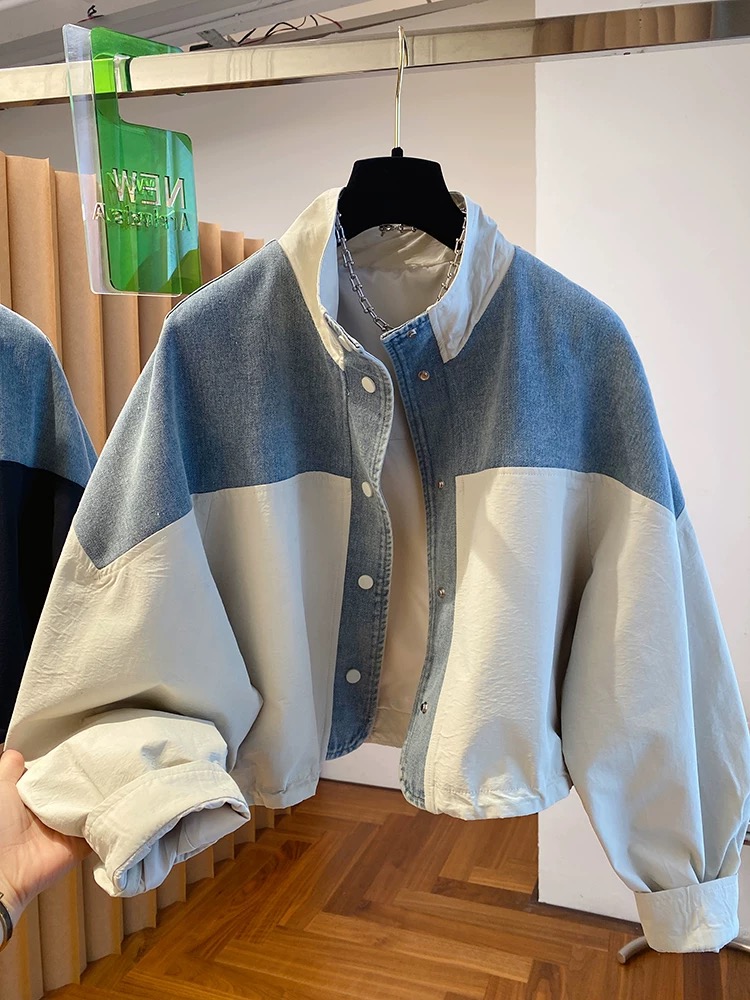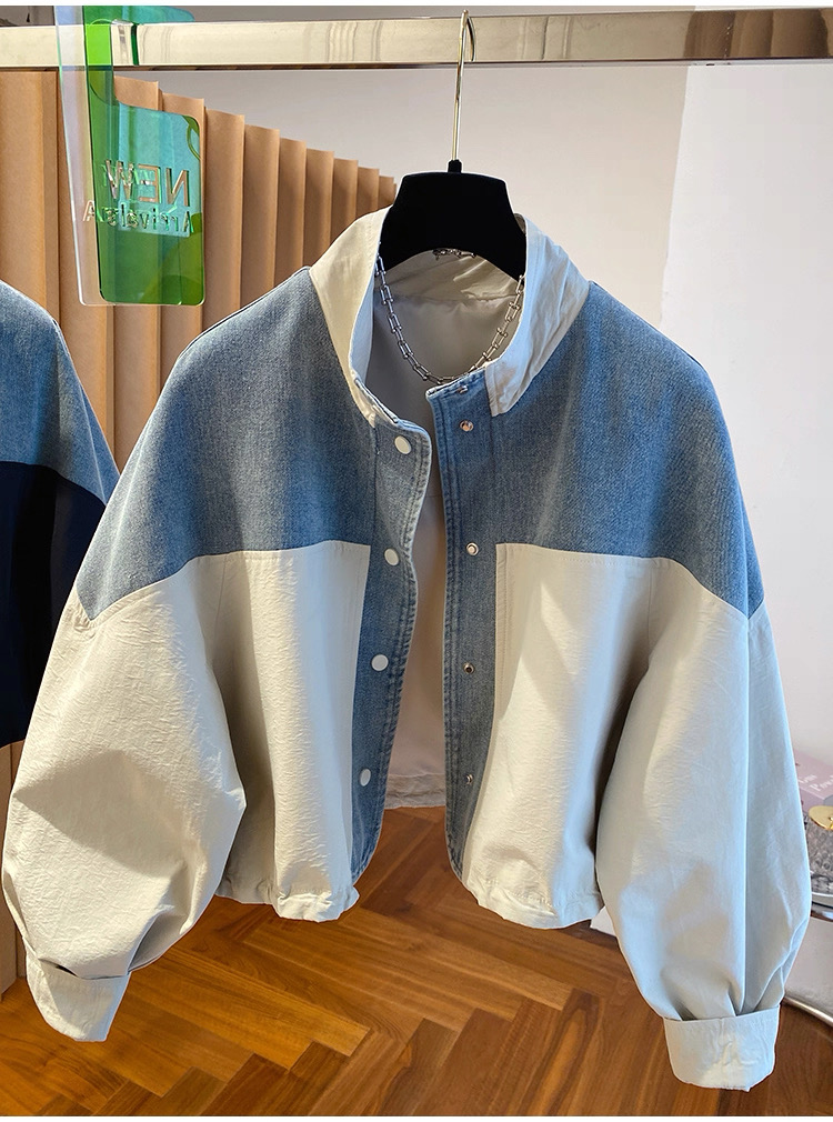 유럽 상품 데님 패치워크 스탠드 칼라 여성 코트 2025 가을 새로운 루즈핏 캐주얼 다용도 쇼트 스타일 재킷 맨위