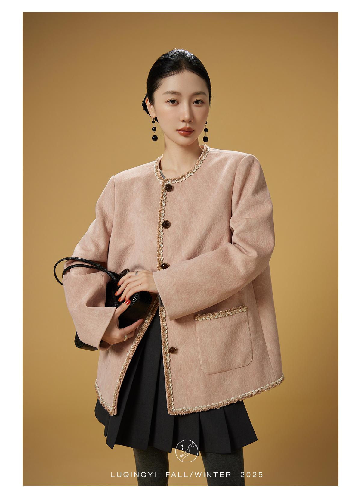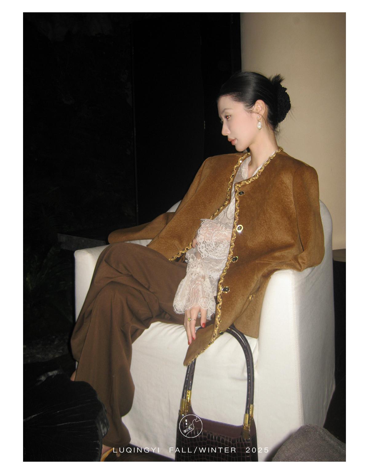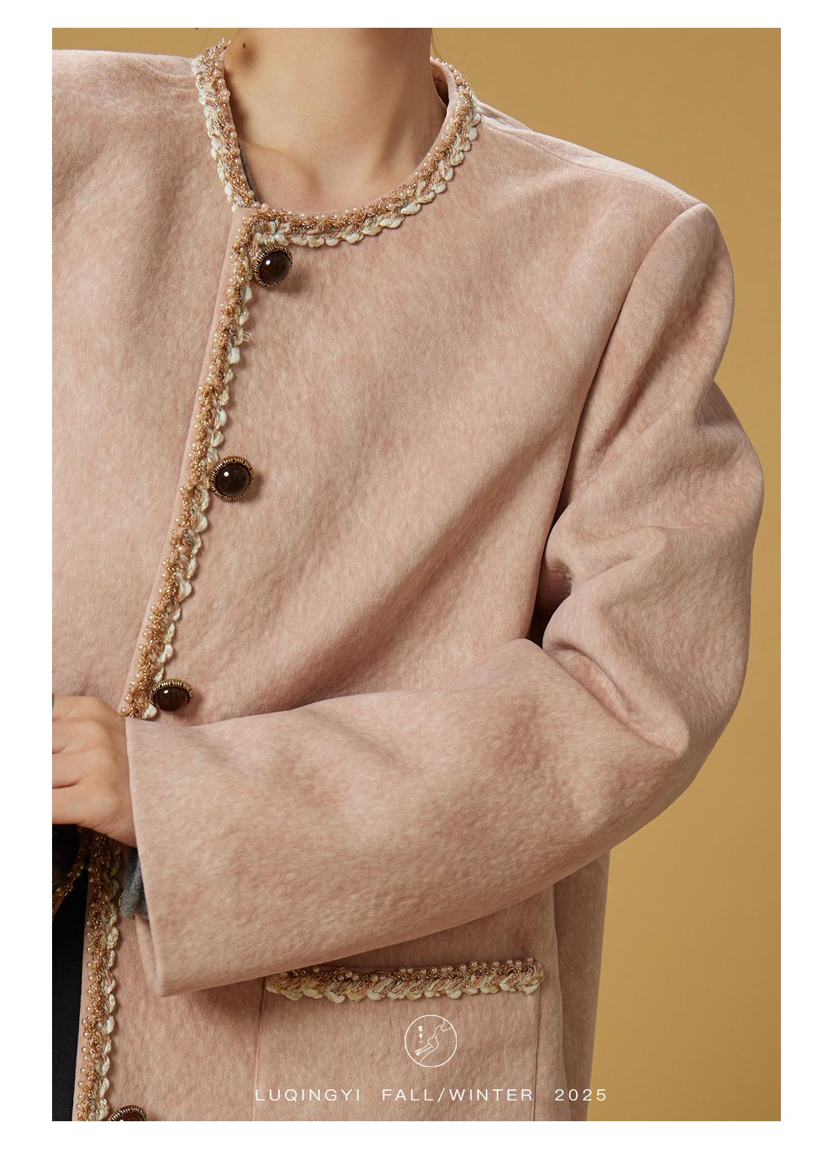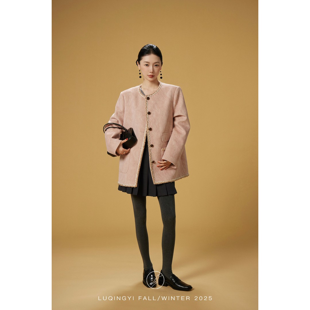 가을 겨울 베이지 색 플리스 여성 코트 2025 새로운 자이언트 잘 생긴 고유 한 아름다운 품격 작은 샤넬 스타일 꼬집기 허리 위로 의류