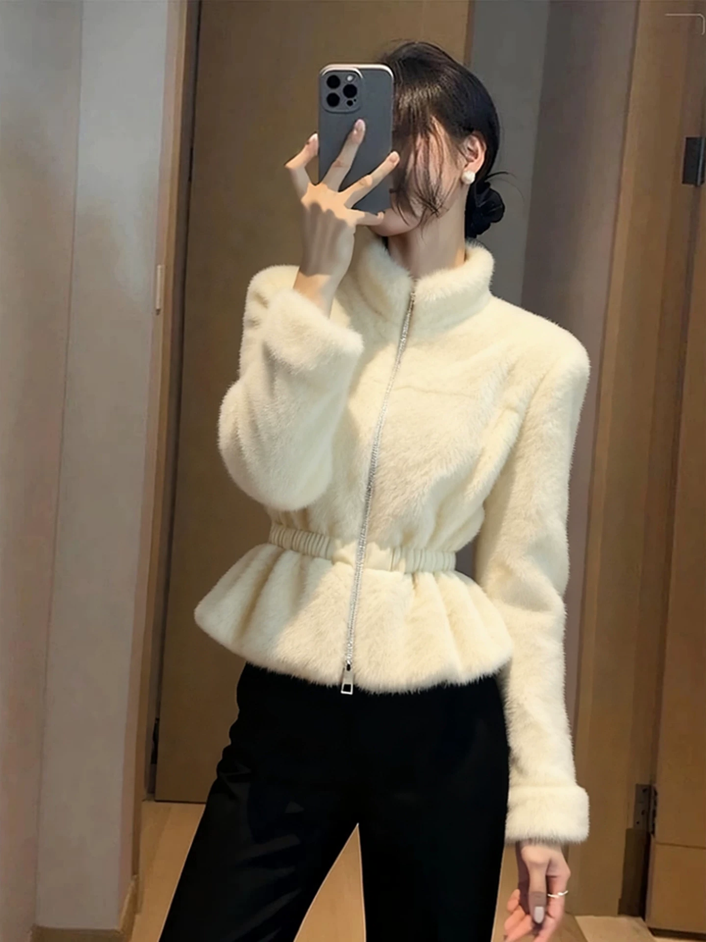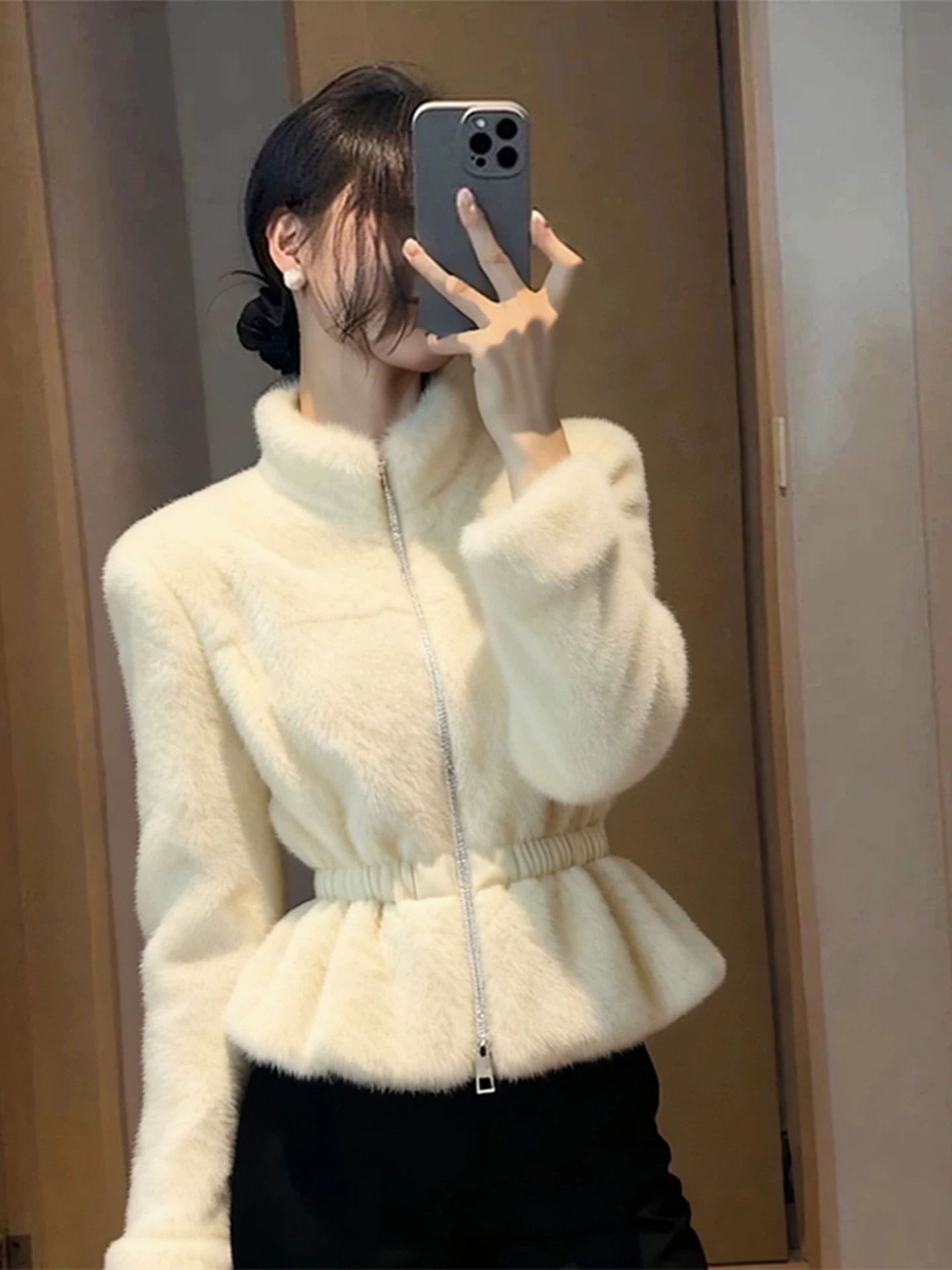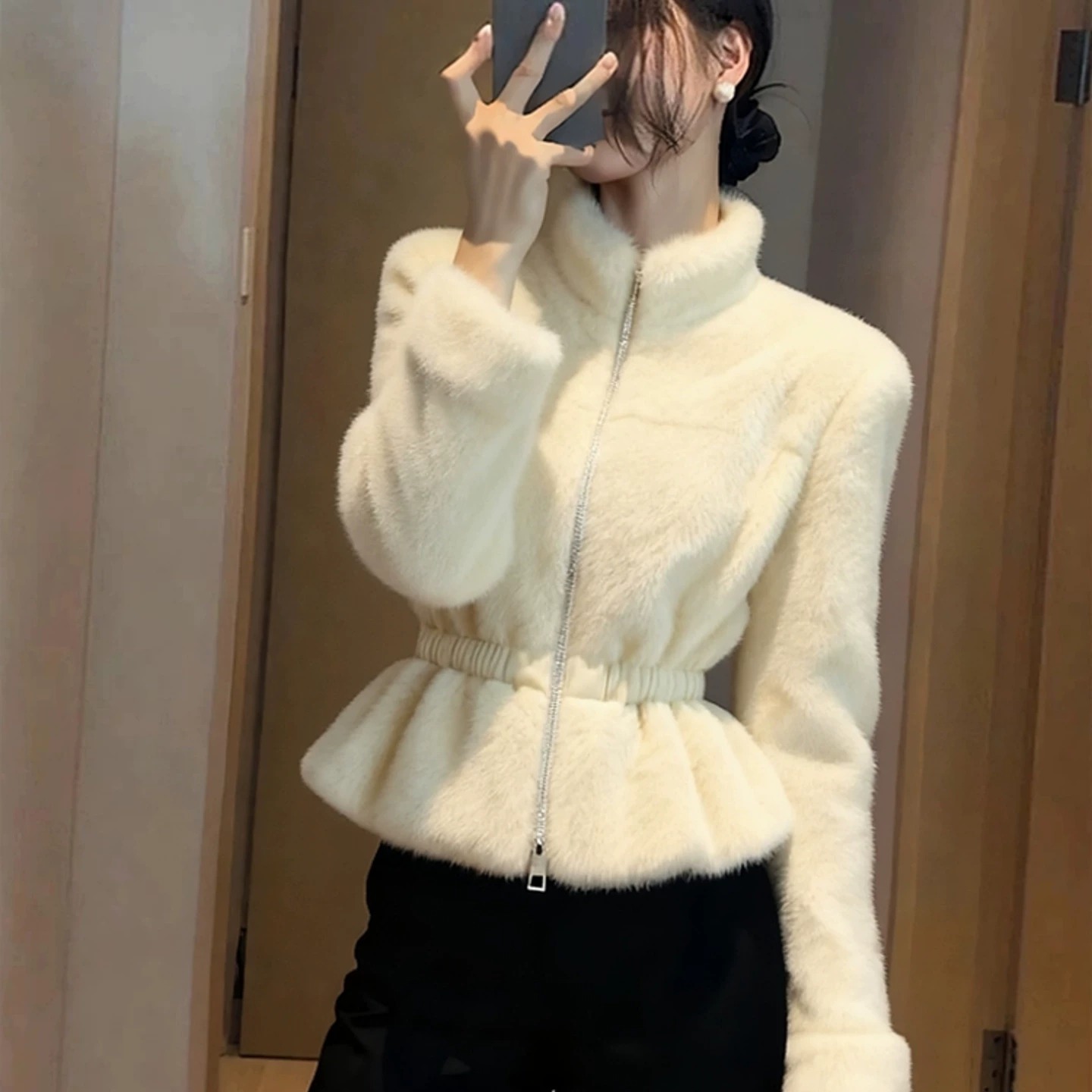 가을 겨울 베이지 색 플리스 여성 코트 2025 새로운 자이언트 잘 생긴 고유 한 아름다운 품격 작은 샤넬 스타일 꼬집기 허리 위로 의류
