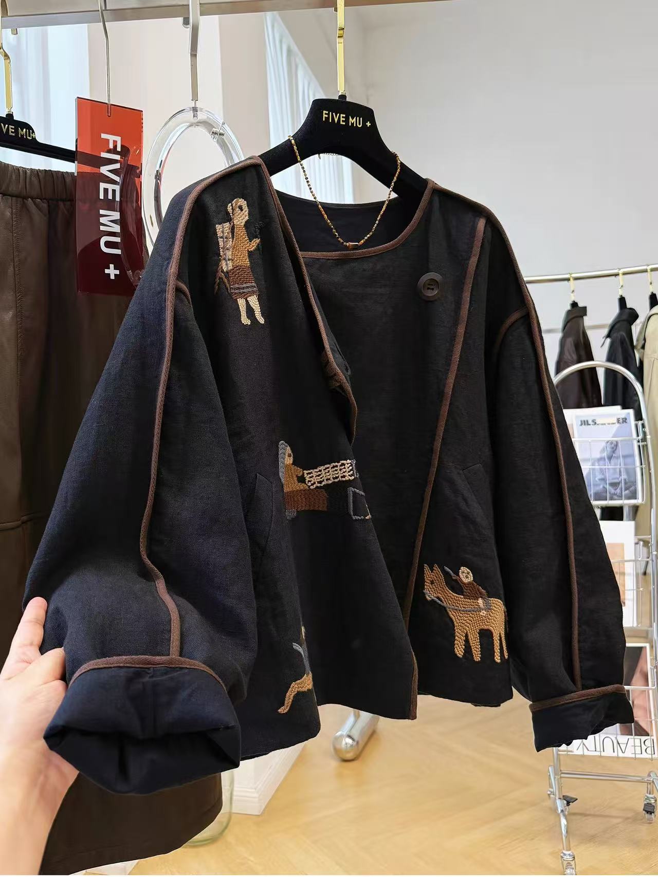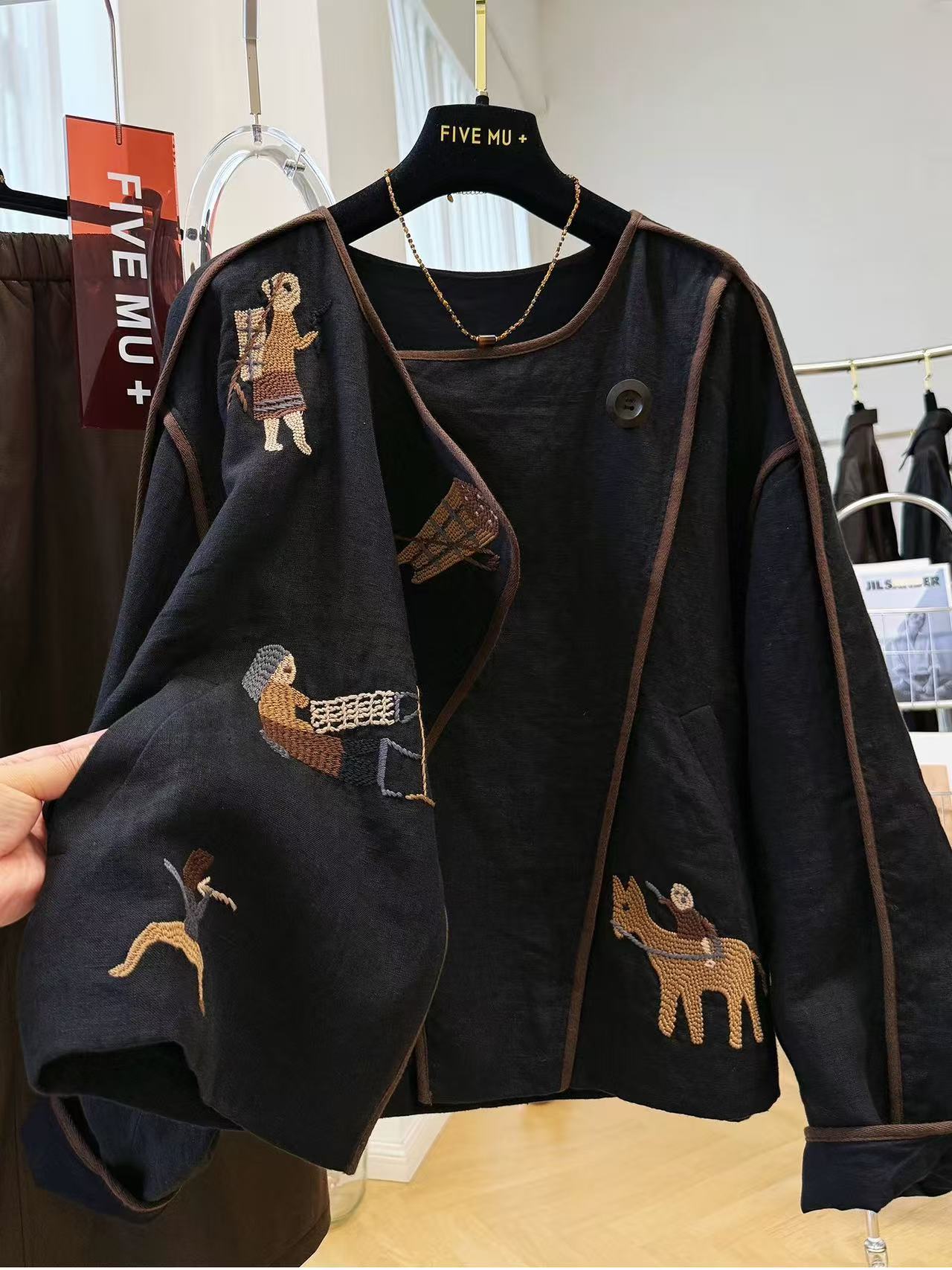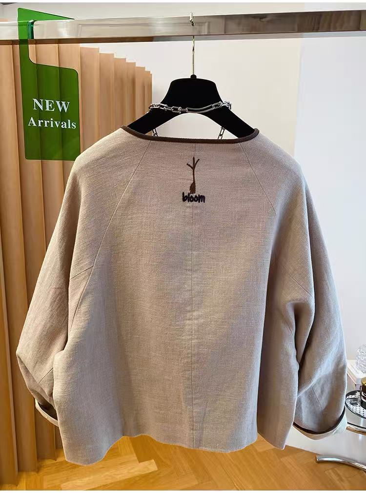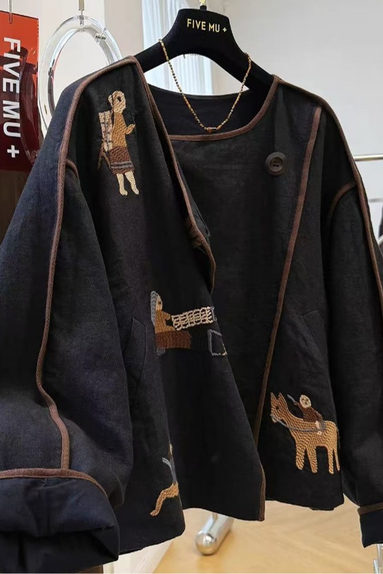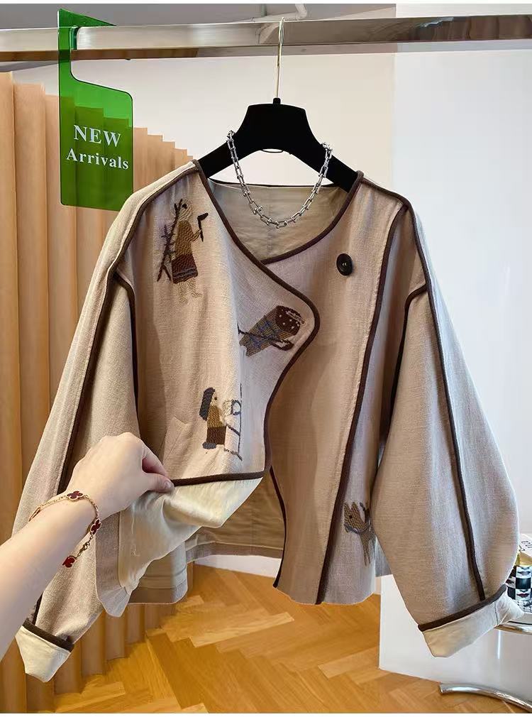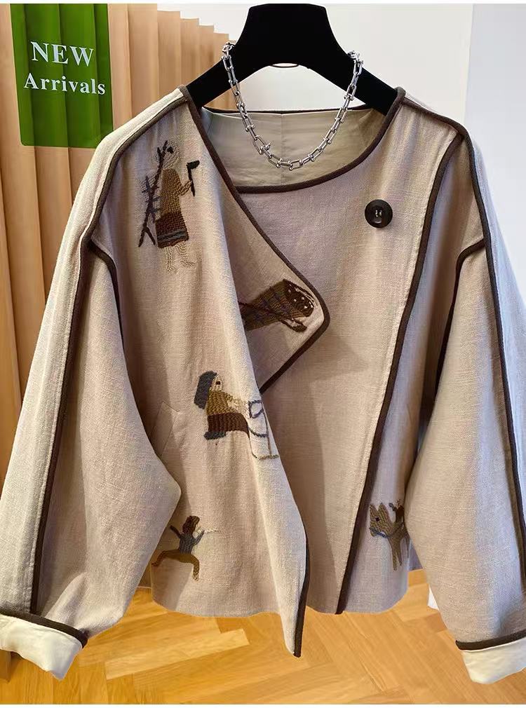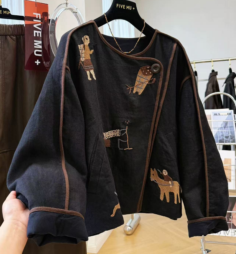 가을 의상 새로운 고급 아마 무거운 작업 자수 라운드 넥 쇼트 스타일 재킷 자이언트 잘 생긴 ~ 중 루즈핏 캐주얼 재킷 맨위
