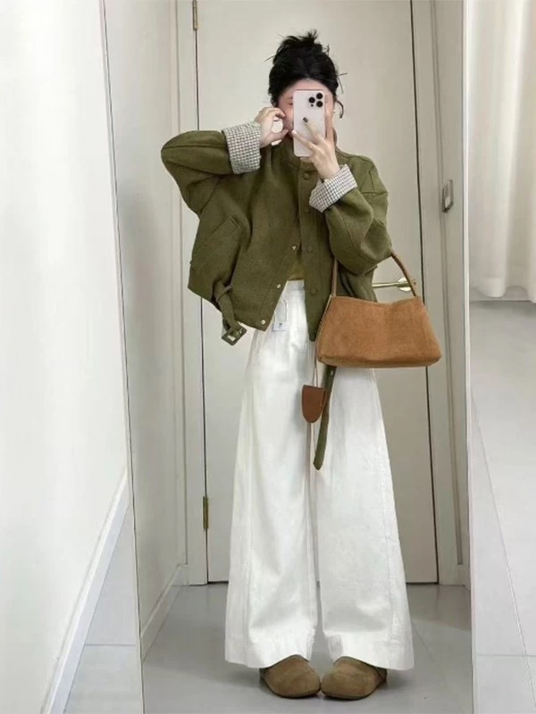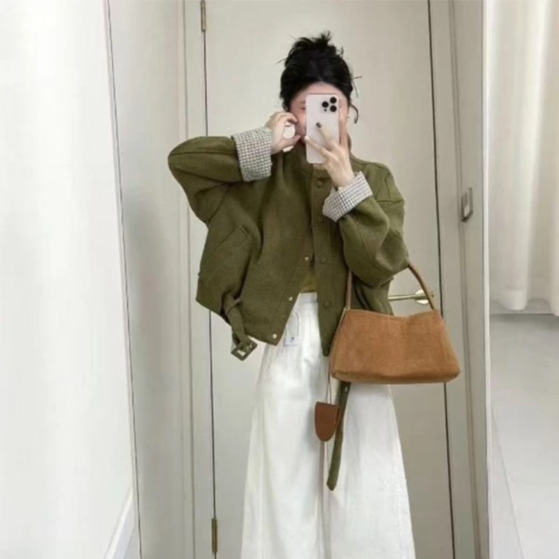 한국 스타일 패션 다용도 라운드 넥 레트로 체크무늬 패치워크 짧은 여성 코트 가을 2025 새로운 루즈핏 슬림해 보이는 맨위