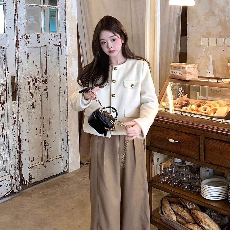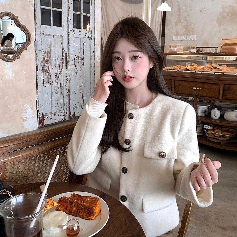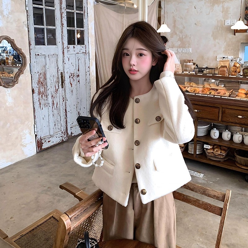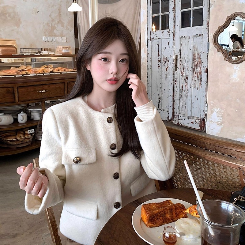 프랑스식 작은 샤넬 스타일 화이트 짧은 여성 코트 가을 겨울 루즈핏 라운드 넥 다용도 고급 센스 품격 슬림해 보이는 단추 오픈 가디건