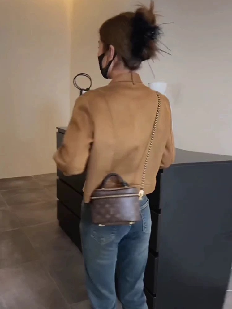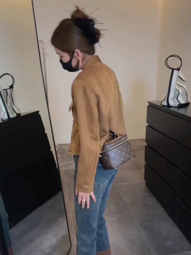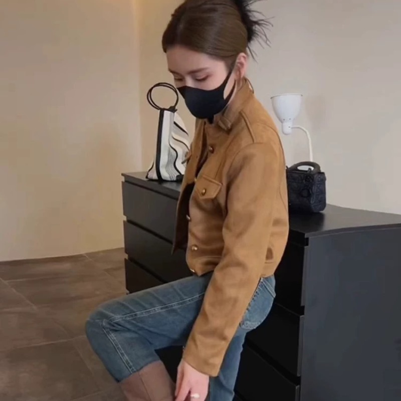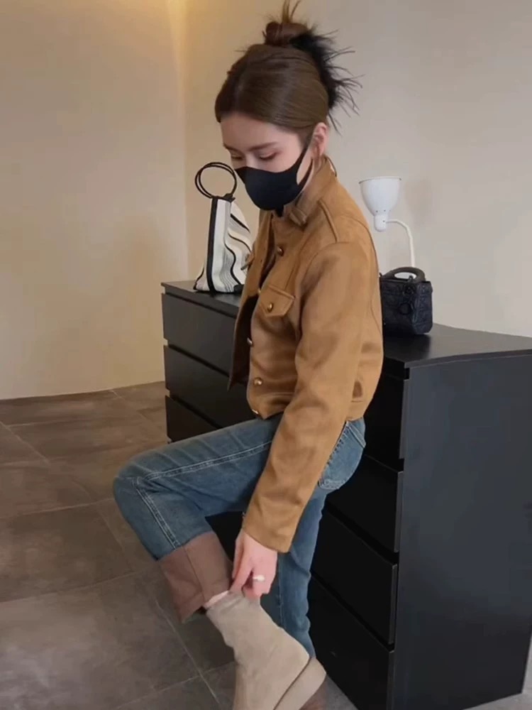 레트로 항구 바람 디자인 작은 남자 스탠딩 칼라 스웨이드 기관차 자켓 짧은 코트 맨위 여자 2024 이른 가을 새로운