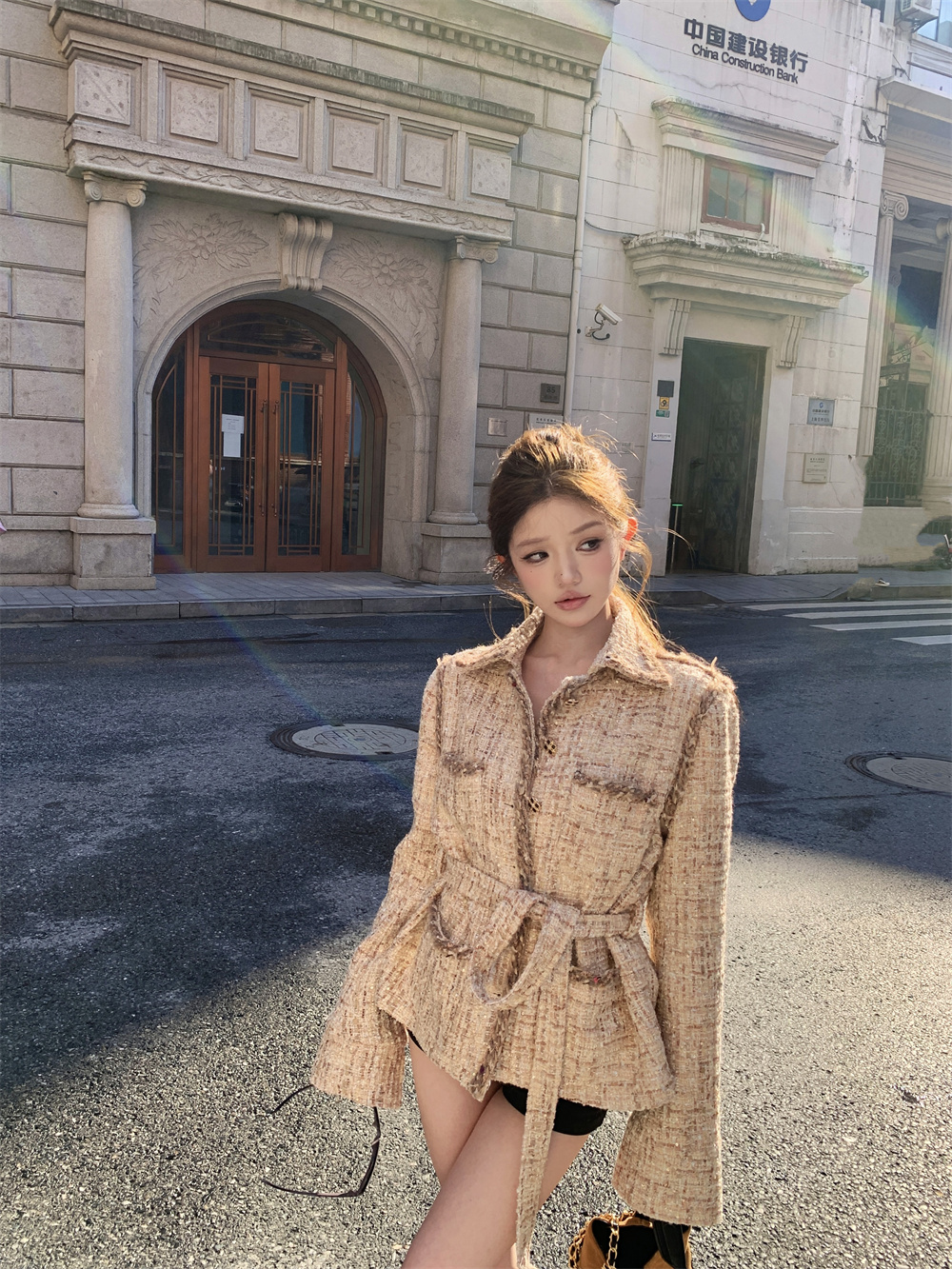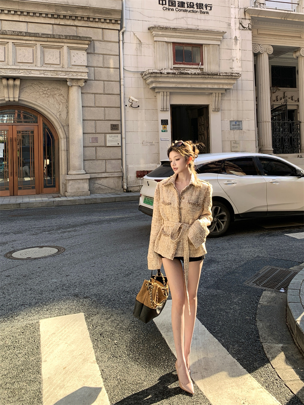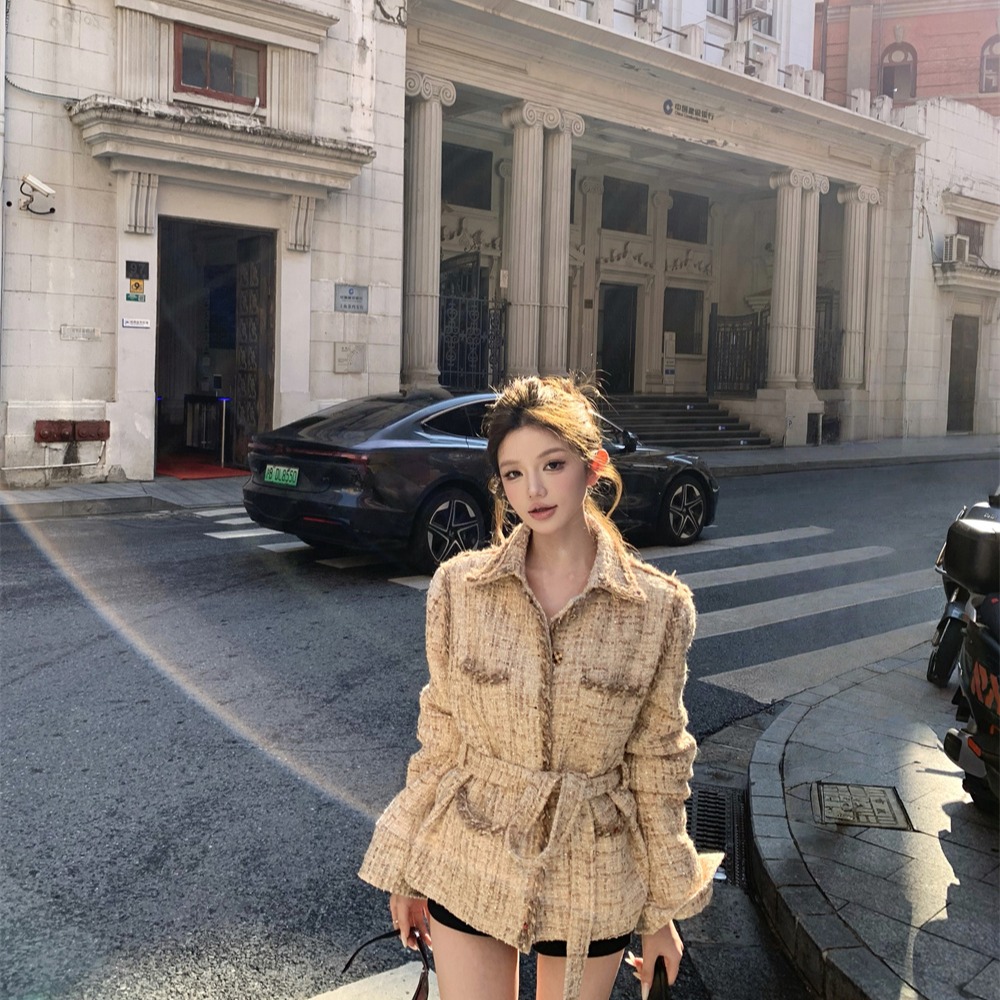 실사 가을 겨울 새로운 품격 천 골드 나만의 것을 가져와 라. 벨트 폴로 칼라 캐주얼 비싼 센스 샤오시엔 재킷
