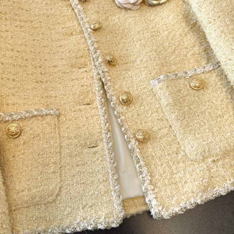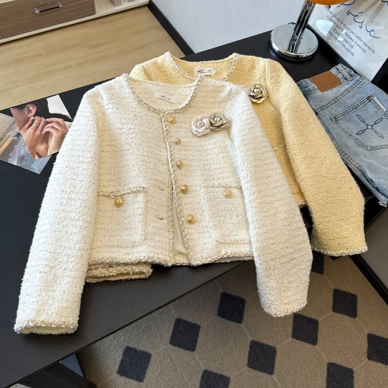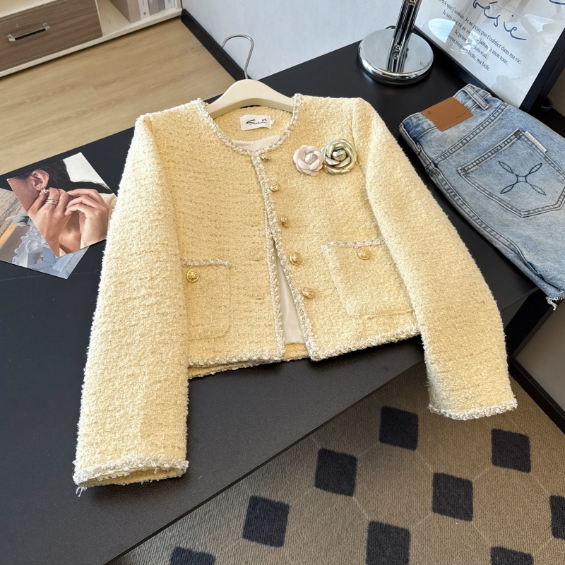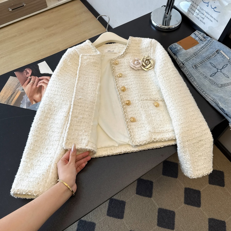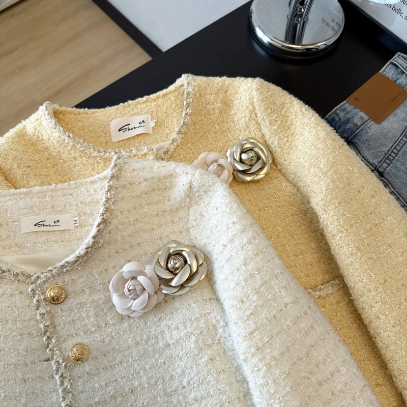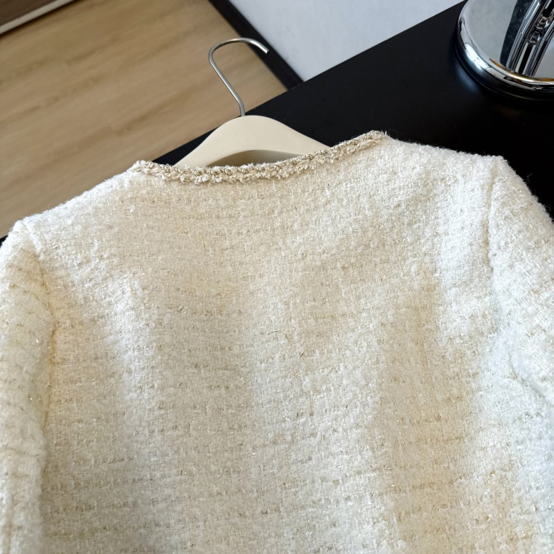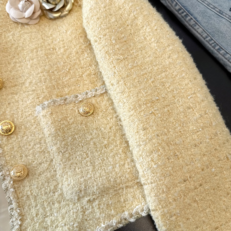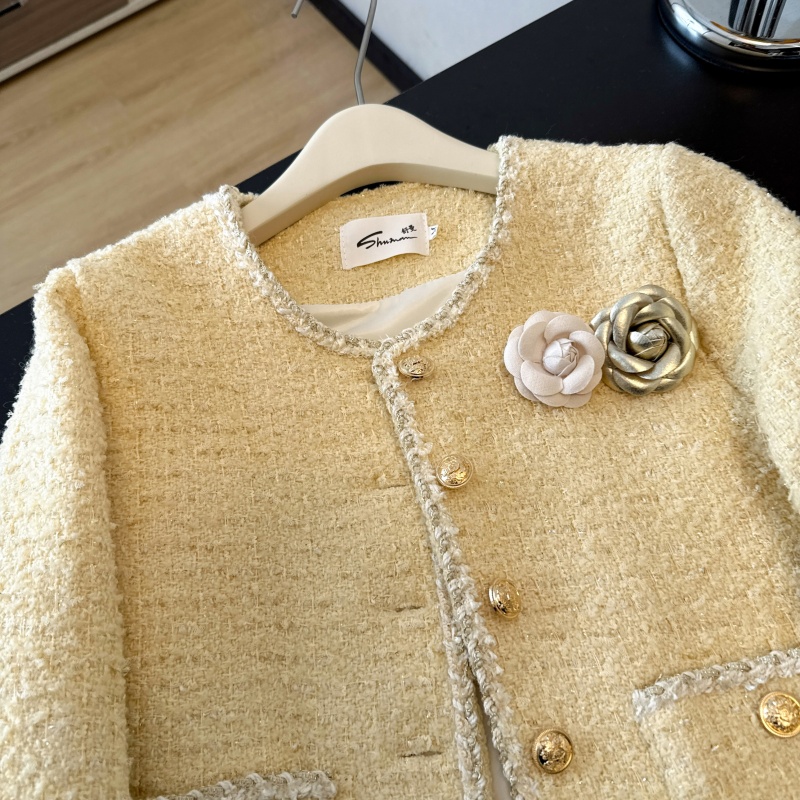 프랑스식 무거운 작업 부드러운 바람 라운드 넥 더블 주머니 트위드 짜임 작은 샤넬 스타일 외부 위안 다운 외투
