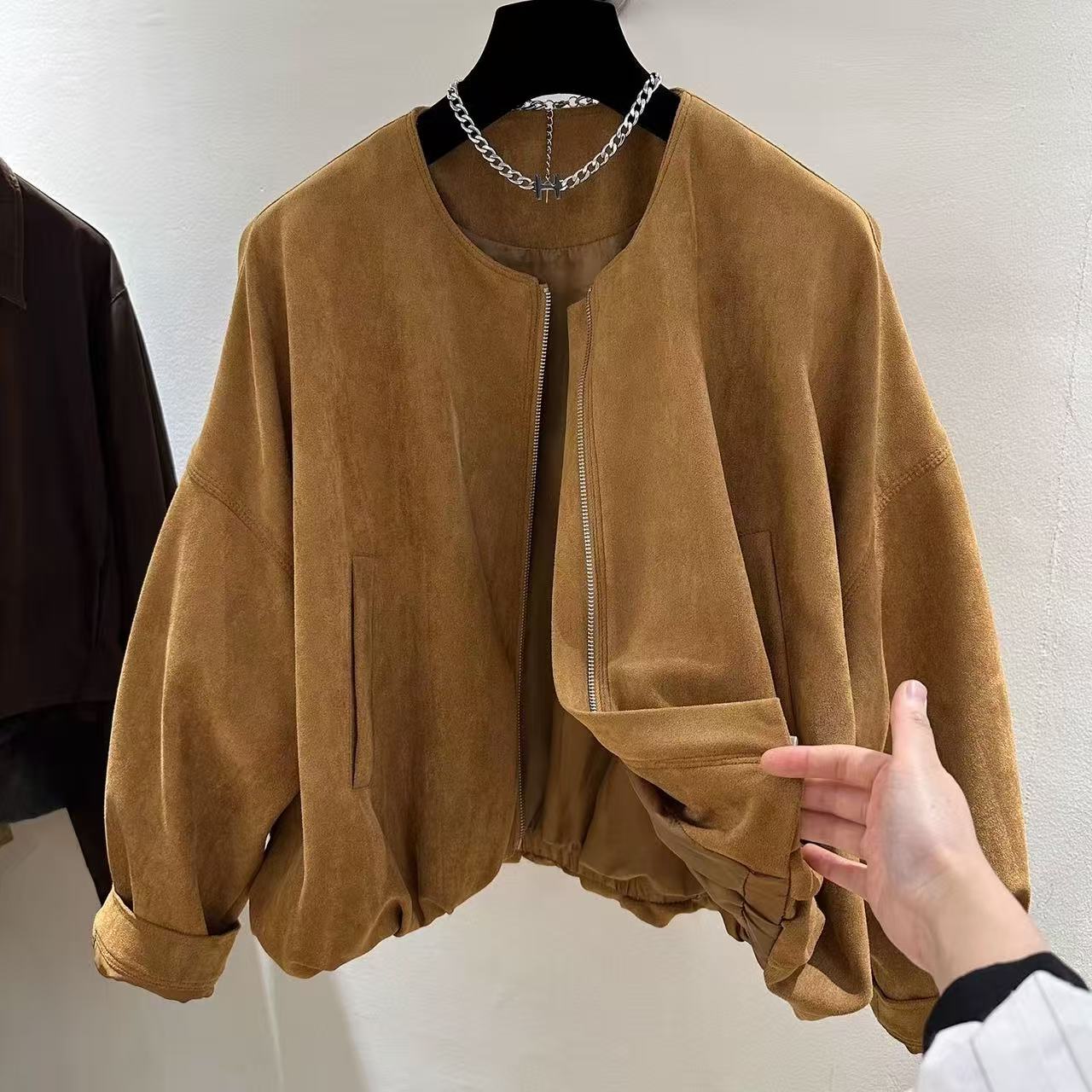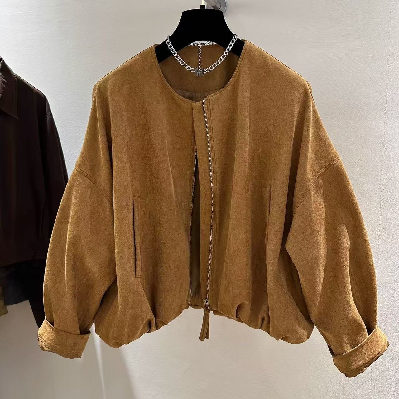 가을 새로운 2025 루즈핏 슬림해 보이는 레트로 다용도 스웨이드 원단 라운드 넥 지퍼 재킷 재킷 외국 가스 맨위 여성