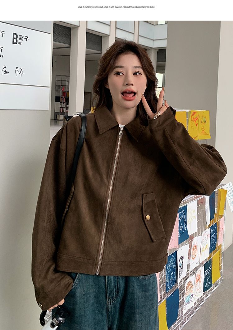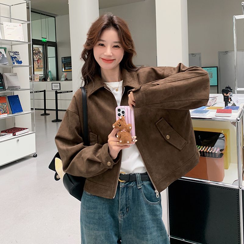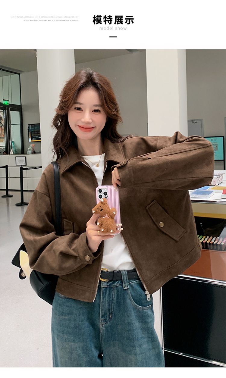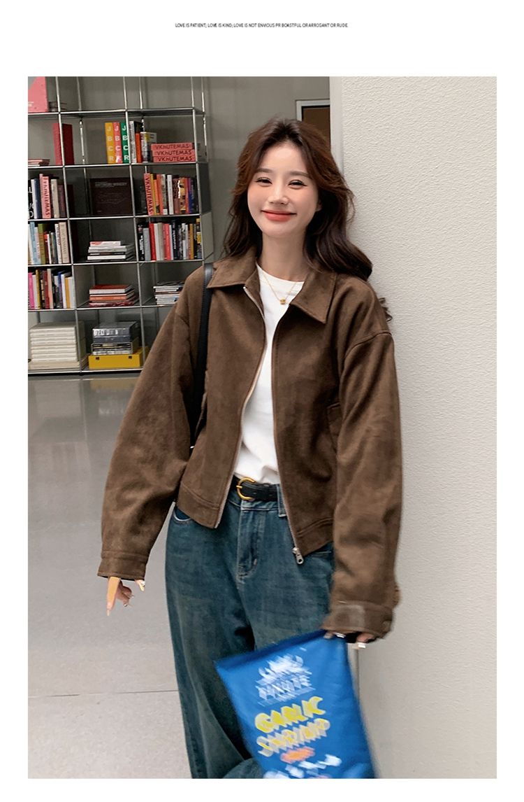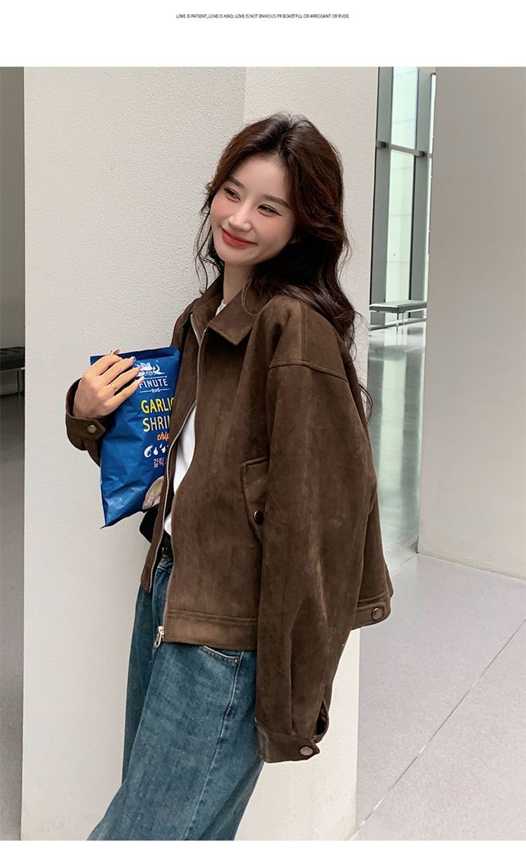 아름다움 라드. 쇼트 스타일 스웨이드 원단 여성 아메리칸 레트로 가죽 재킷