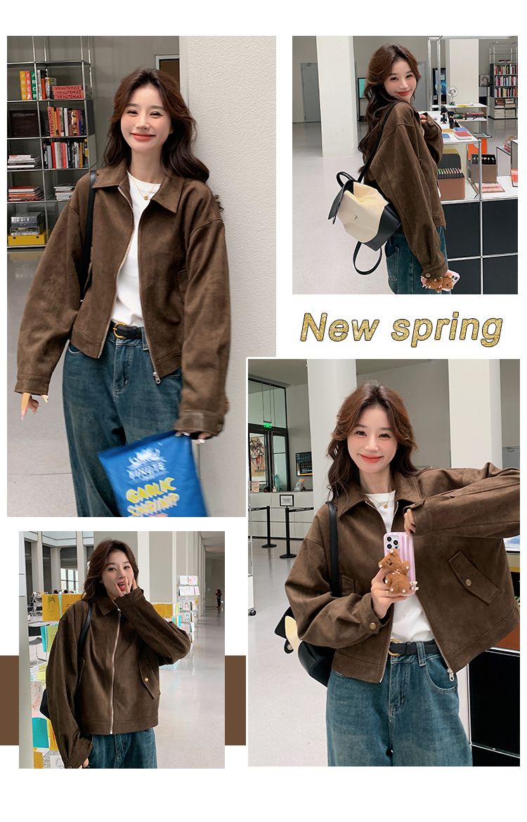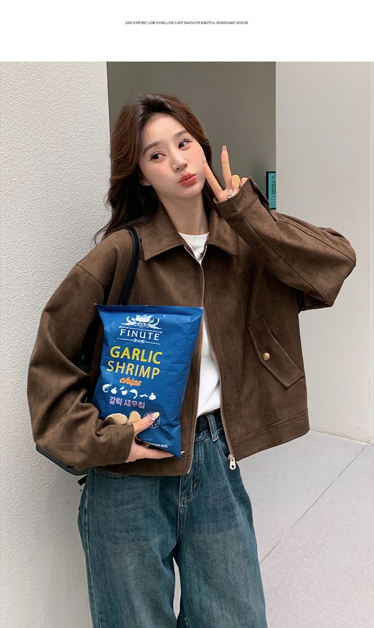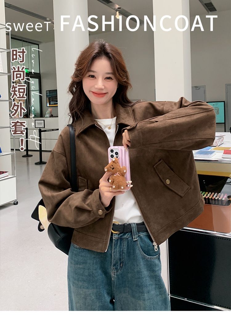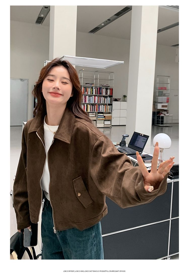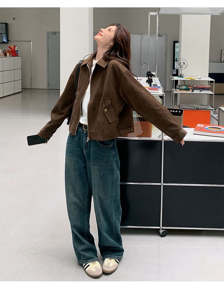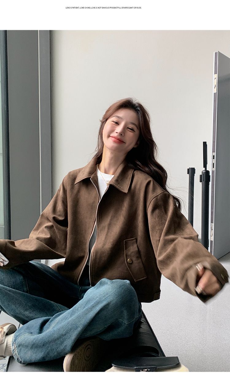 아름다움 라드. 쇼트 스타일 스웨이드 원단 여성 아메리칸 레트로 가죽 재킷
