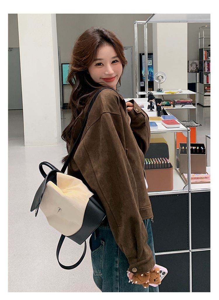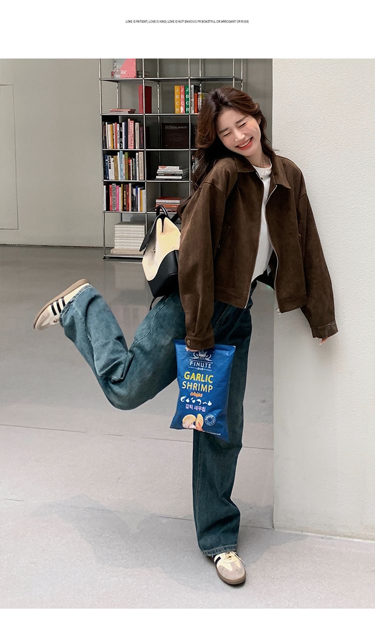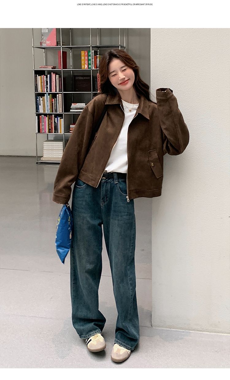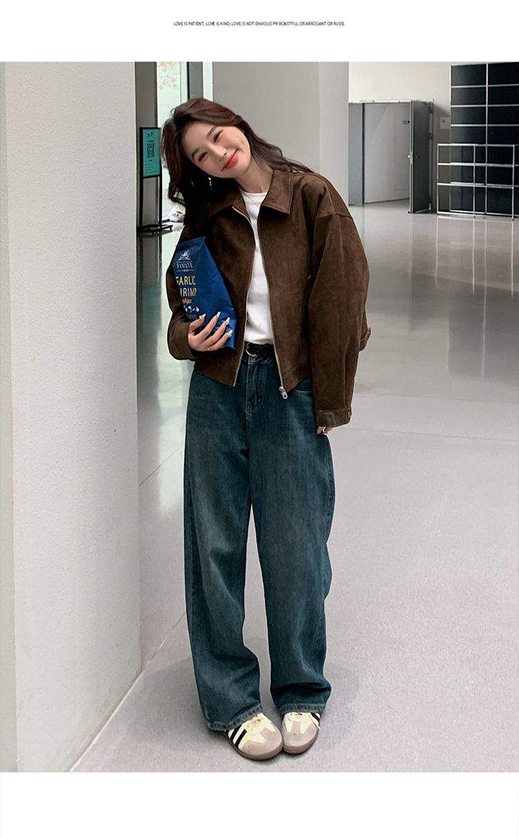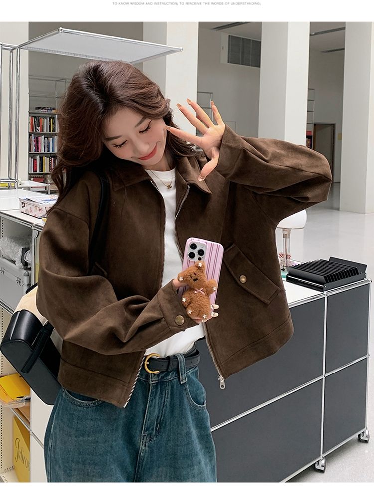 아름다움 라드. 쇼트 스타일 스웨이드 원단 여성 아메리칸 레트로 가죽 재킷