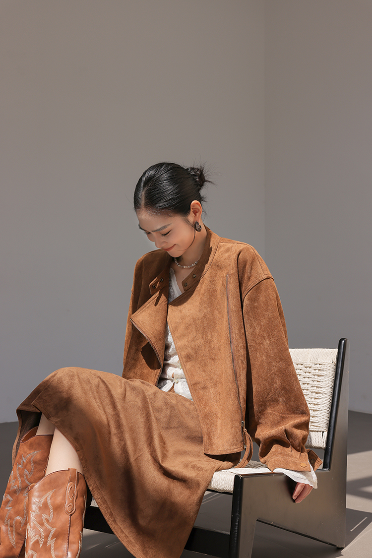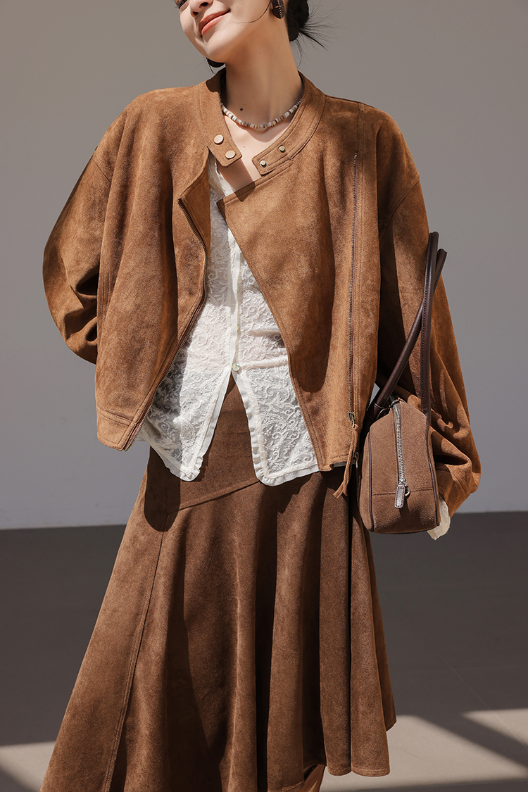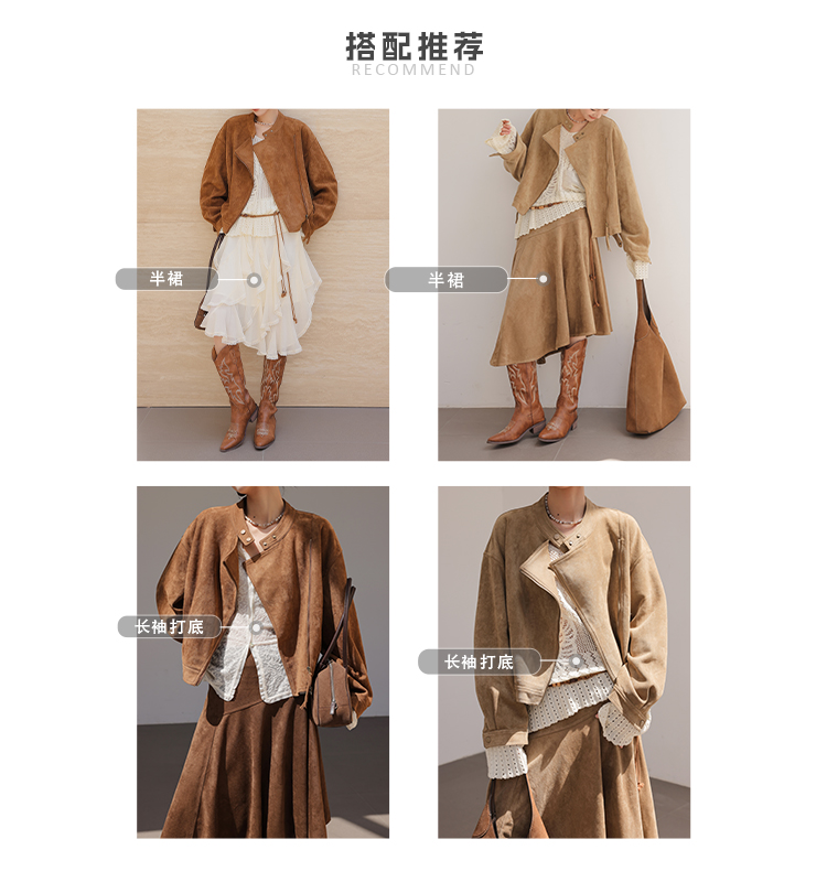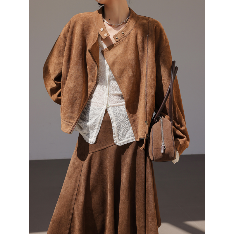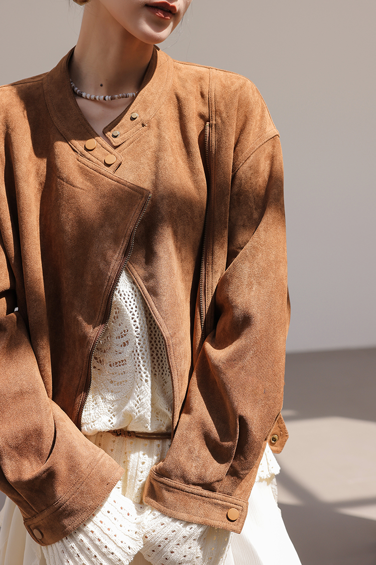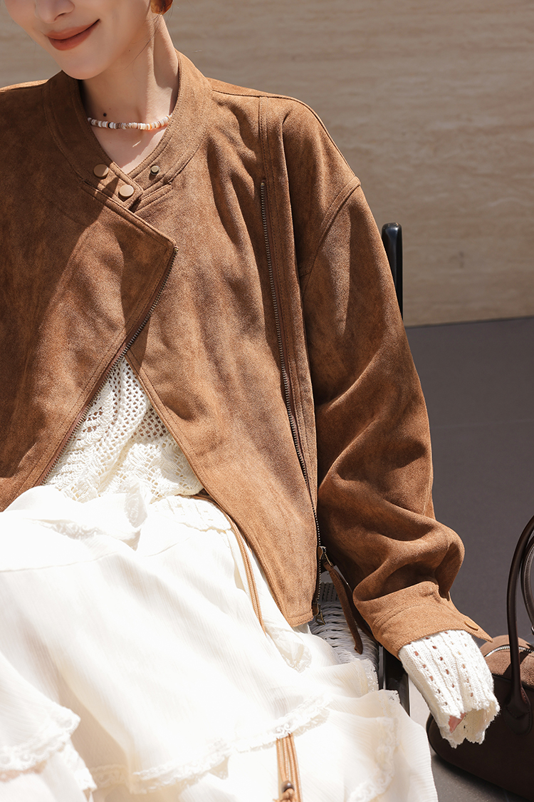 2025 가을 스탠드 칼라 쇼트 스타일 스웨이드 원단 여성 코트 루즈핏 재킷