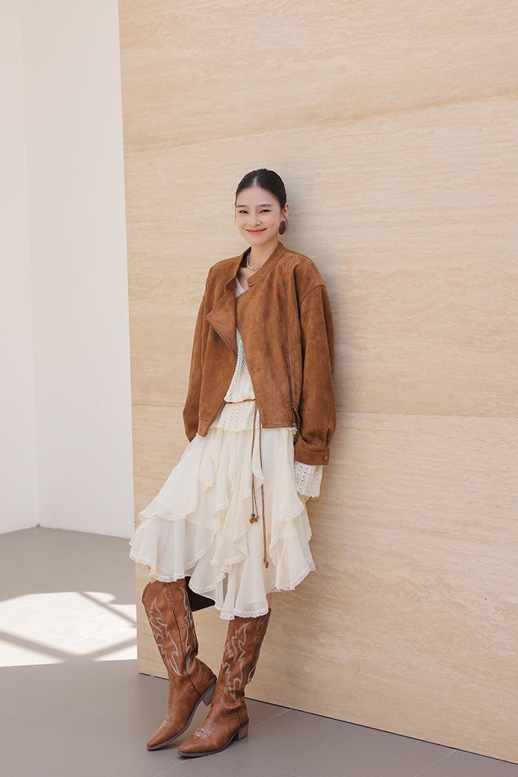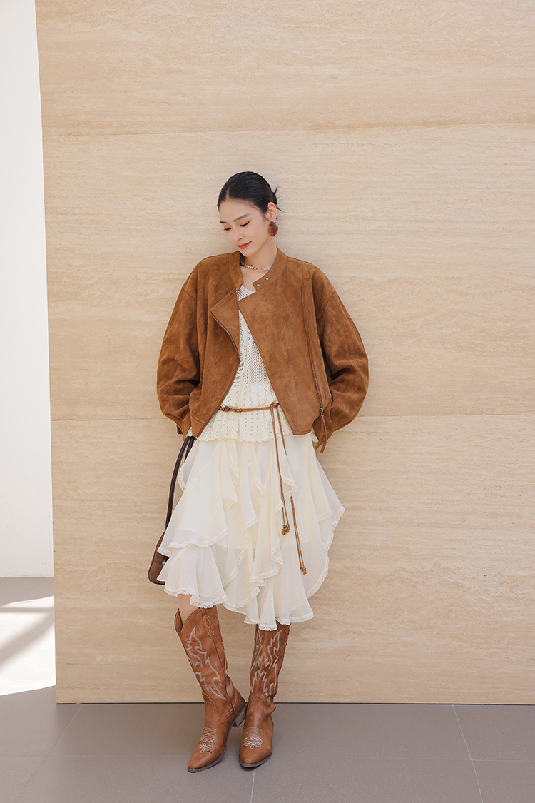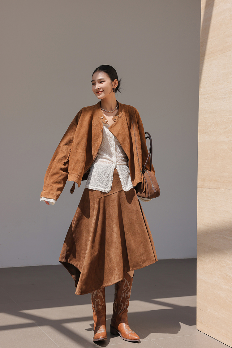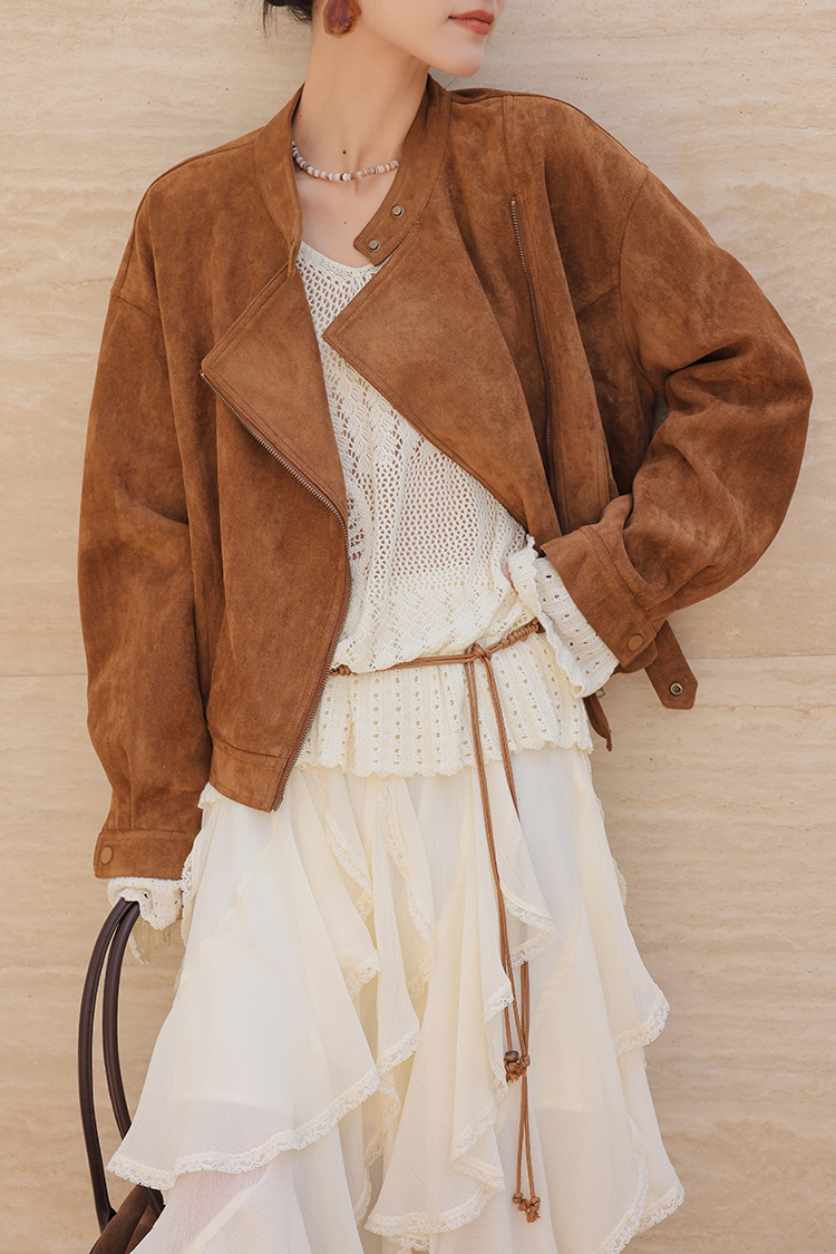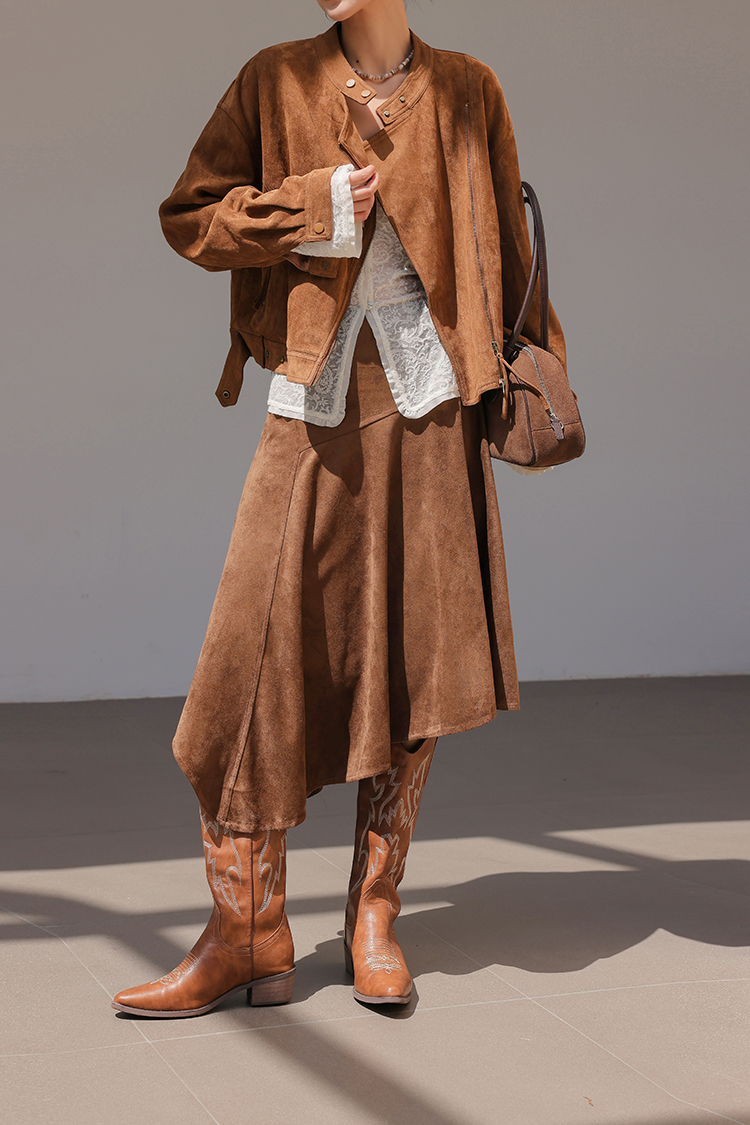 2025 가을 스탠드 칼라 쇼트 스타일 스웨이드 원단 여성 코트 루즈핏 재킷