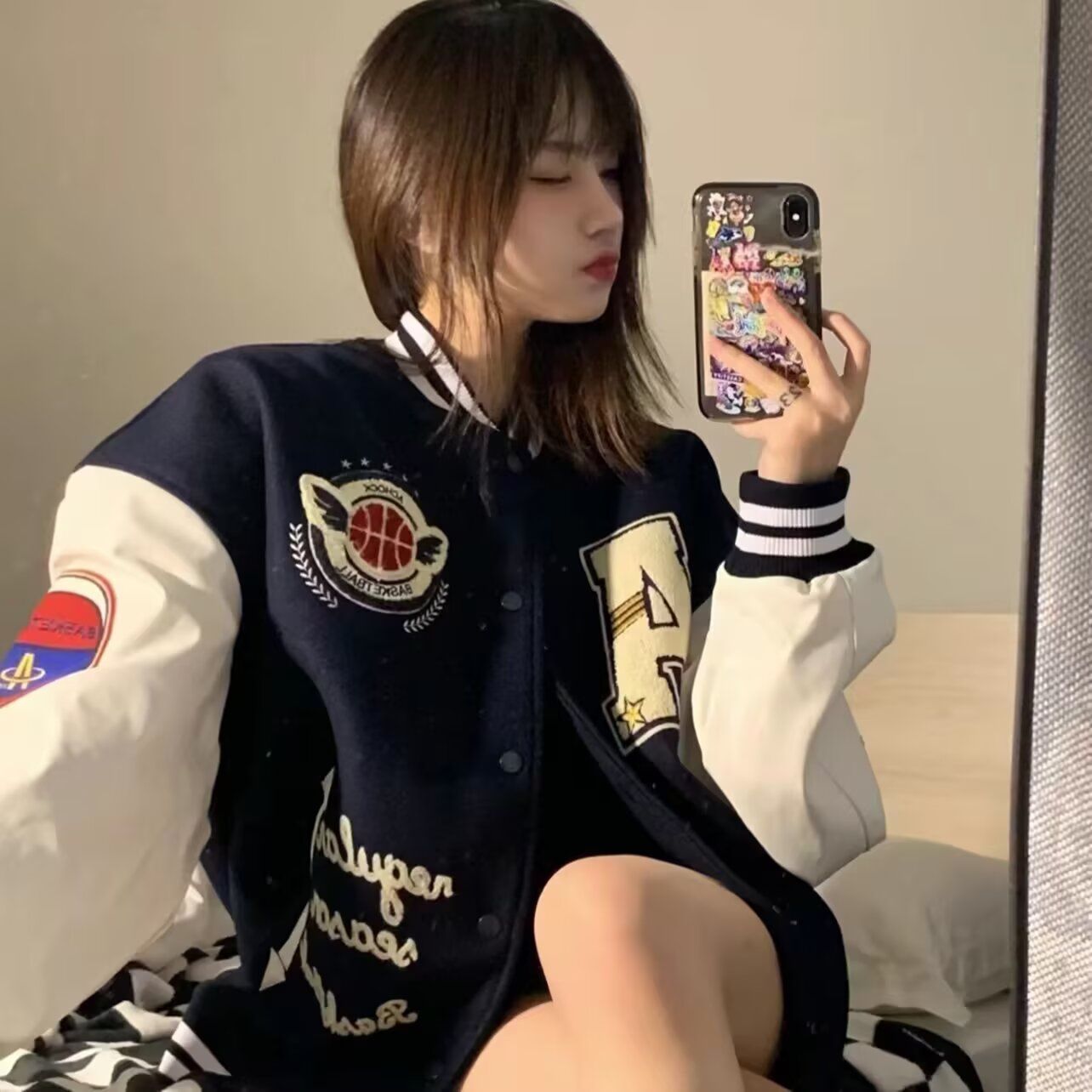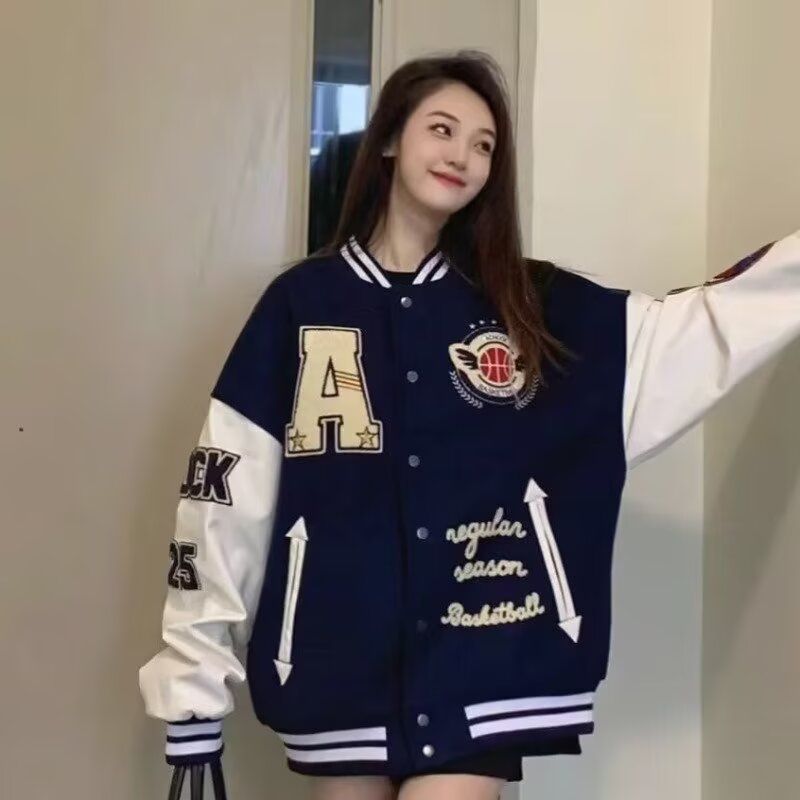 아메리칸 페이크 레이어드 스트라이프 패치워크 폴로 칼라 야구 유니폼 여성 코트