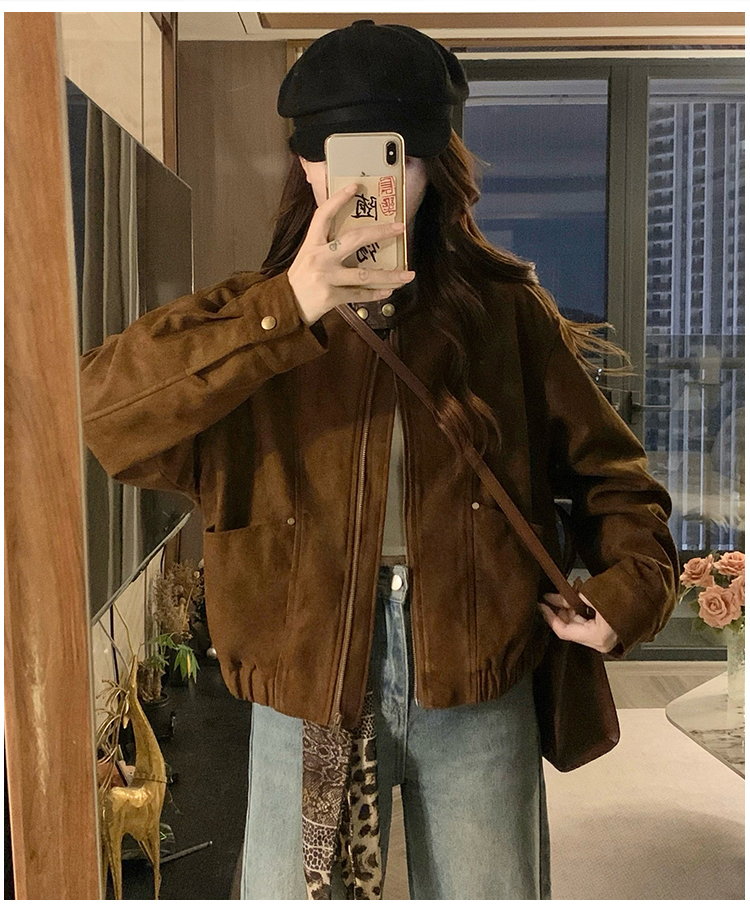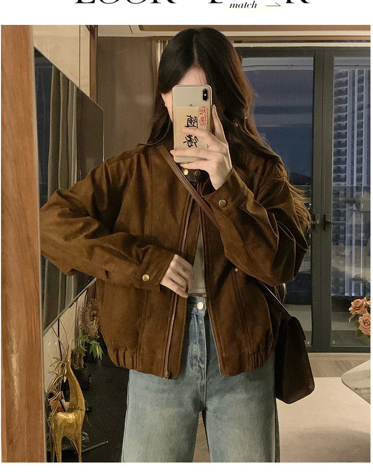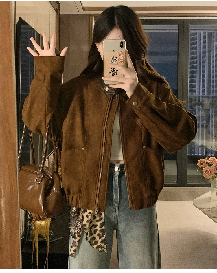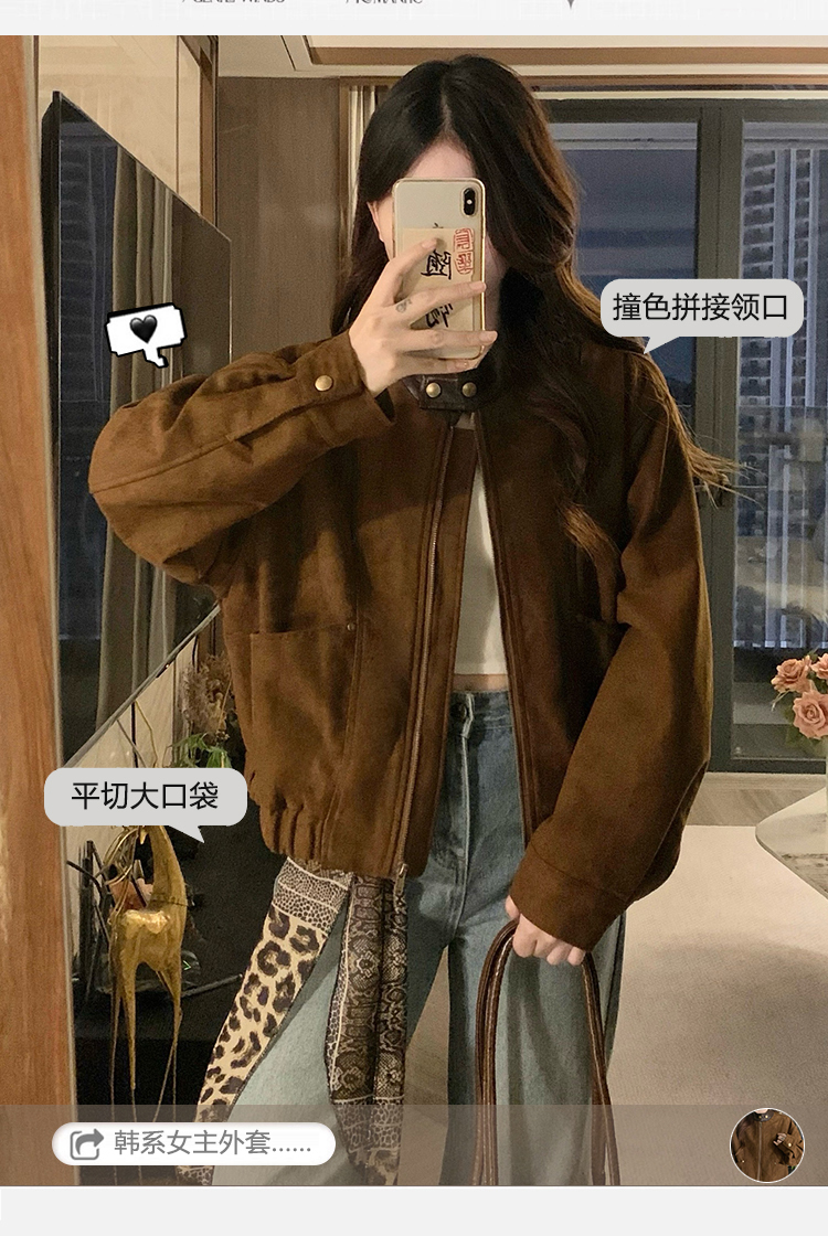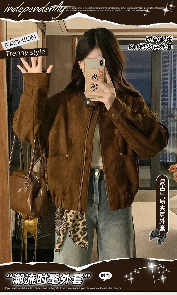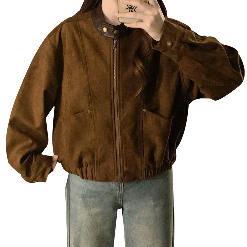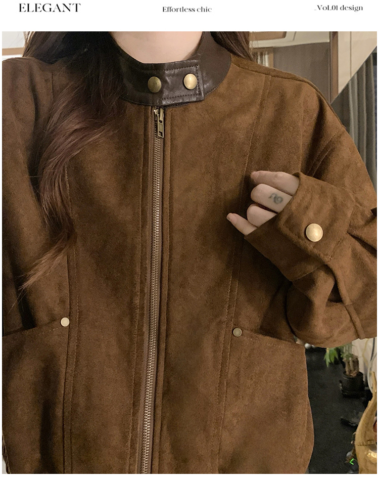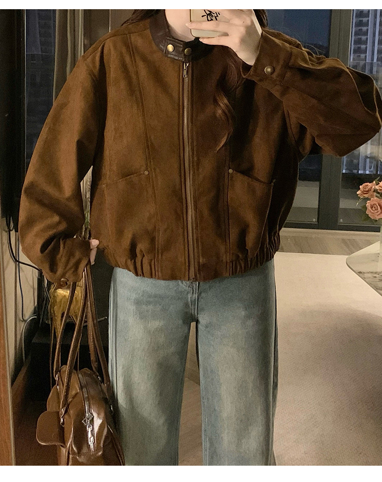 스웨이드 원단 배색 패치워크 쇼트 스타일 연령 감소 재킷