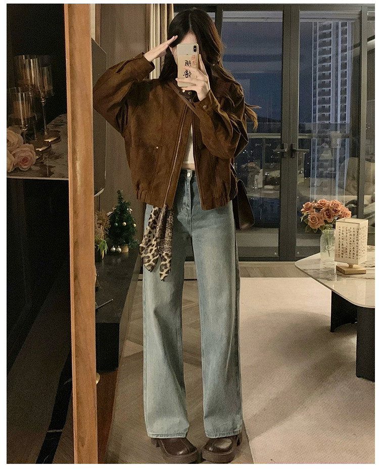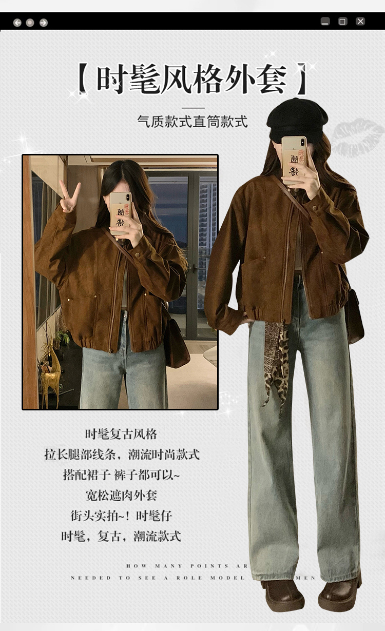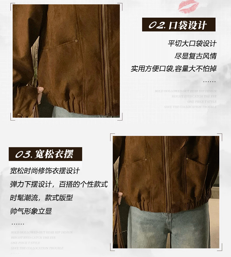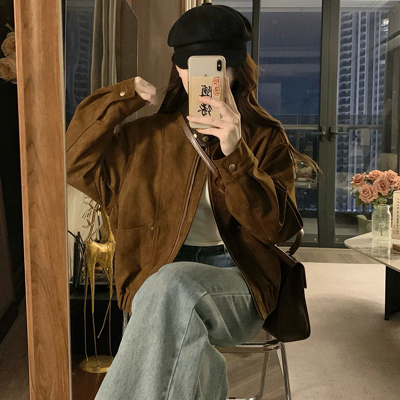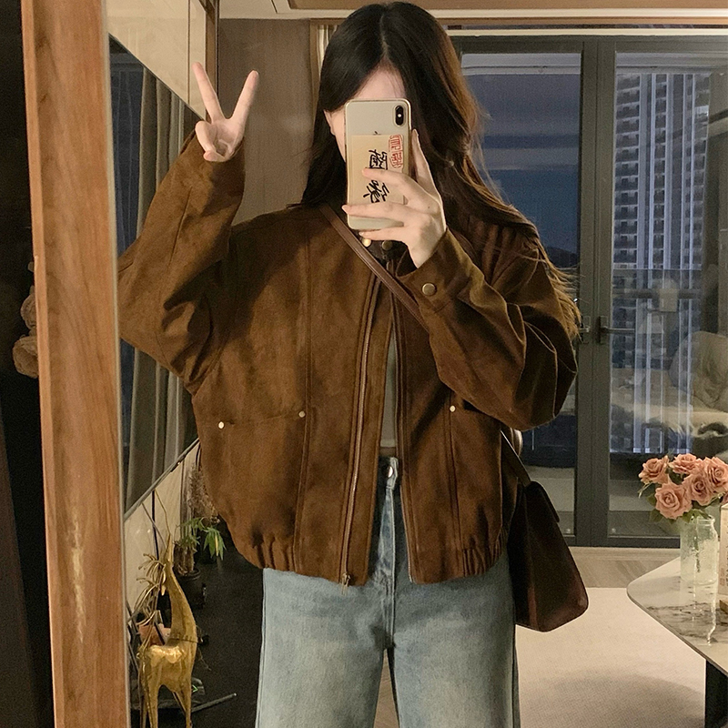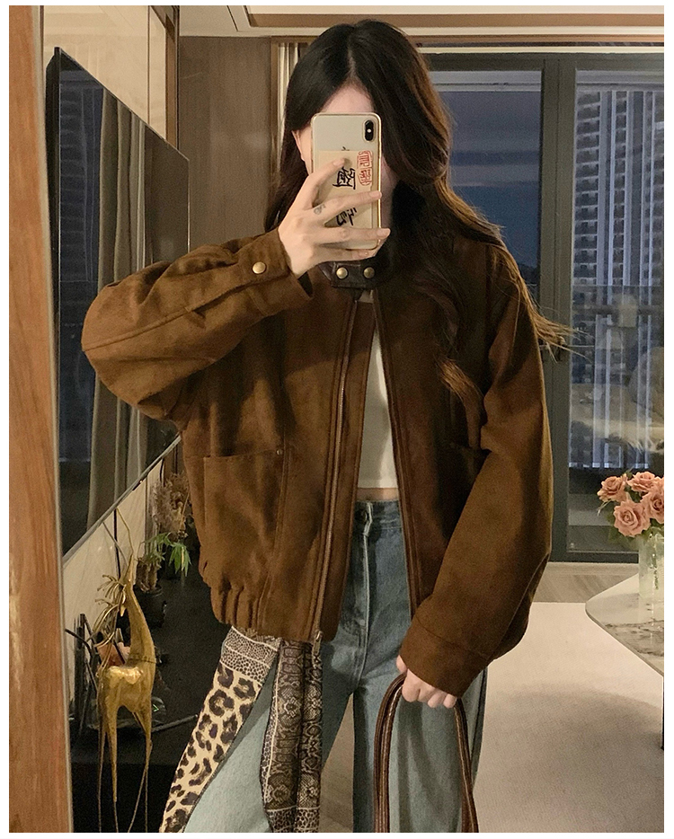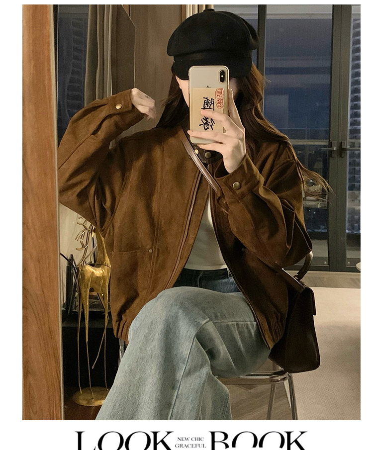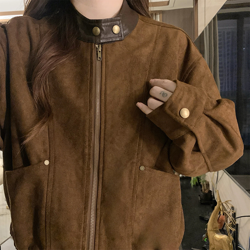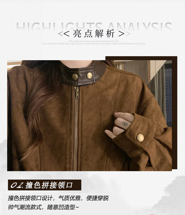 스웨이드 원단 배색 패치워크 쇼트 스타일 연령 감소 재킷