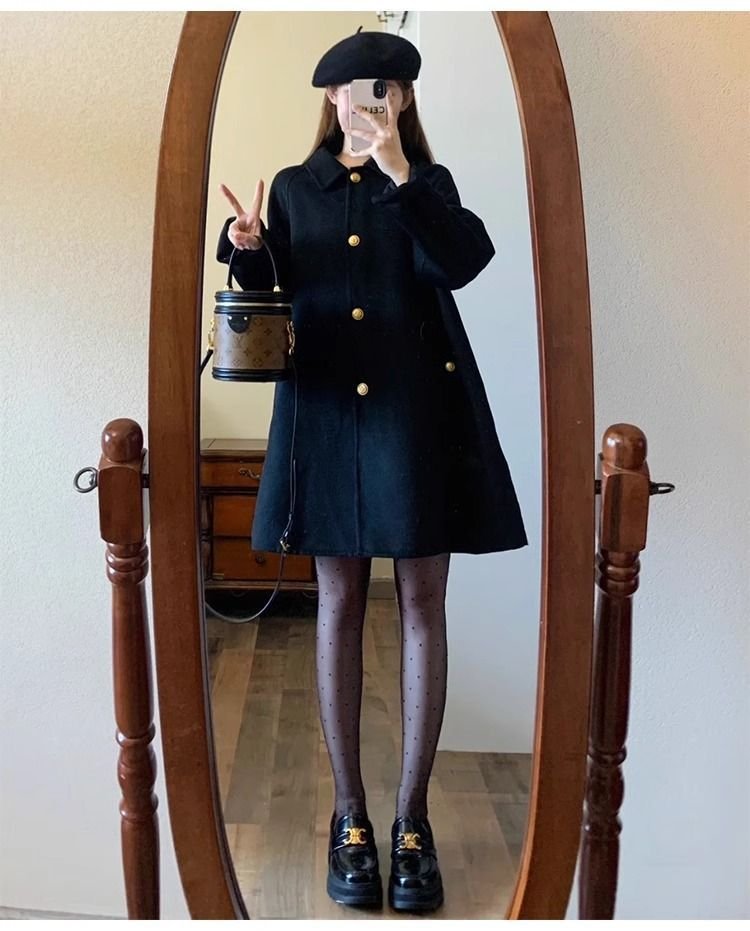 검정색 망토 금속 버클 업 한국 스타일 작은 키 루즈핏 슬림해 보이는 모직 외투