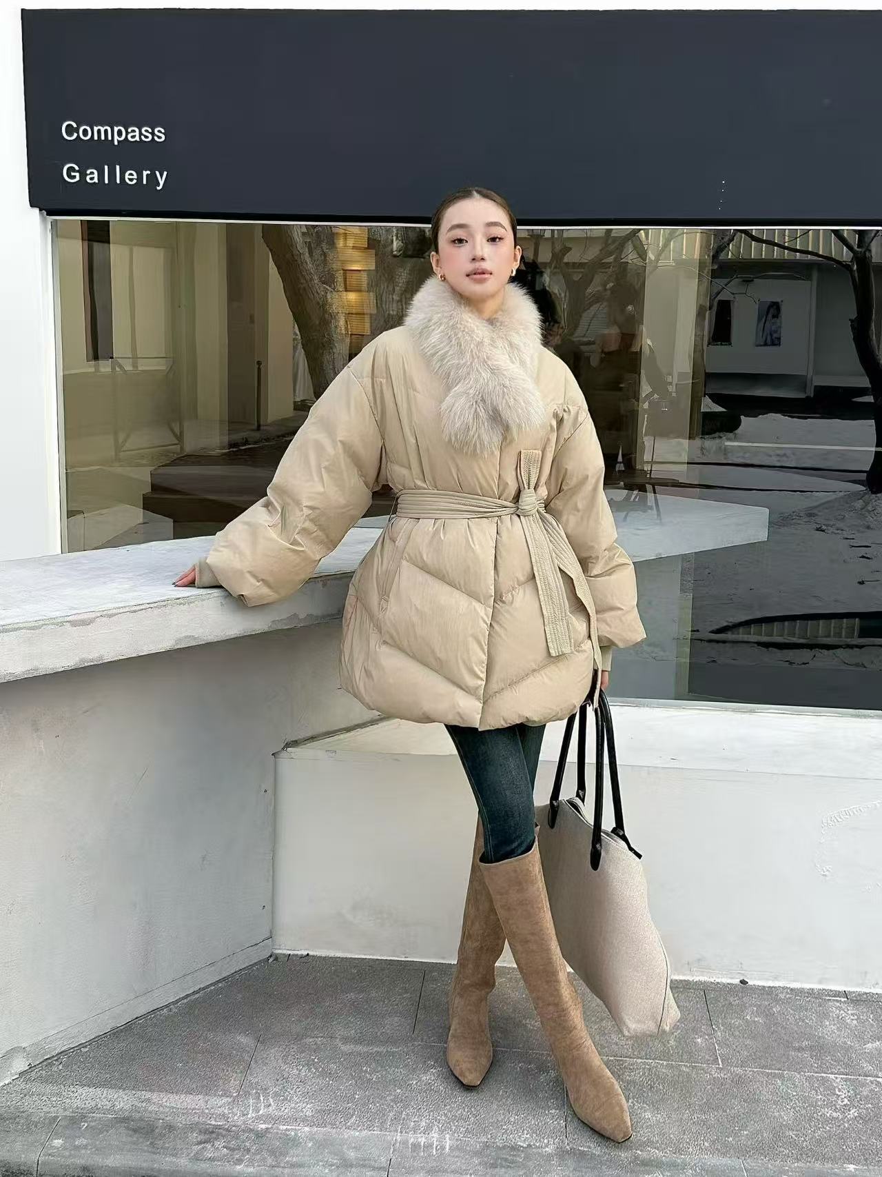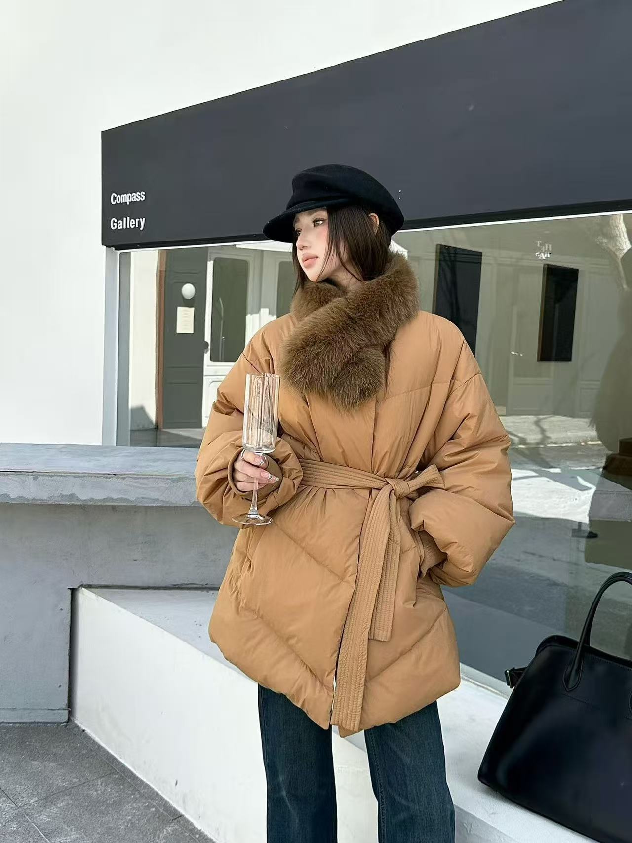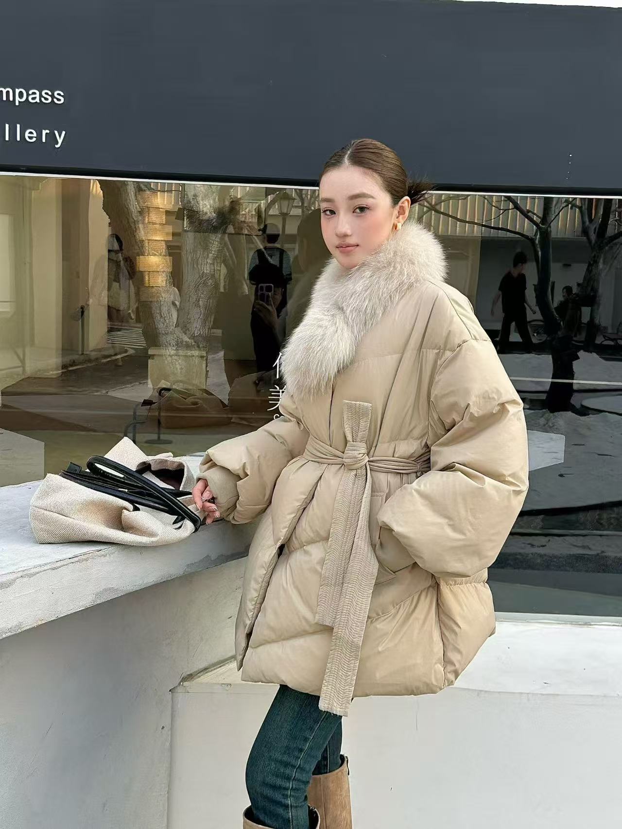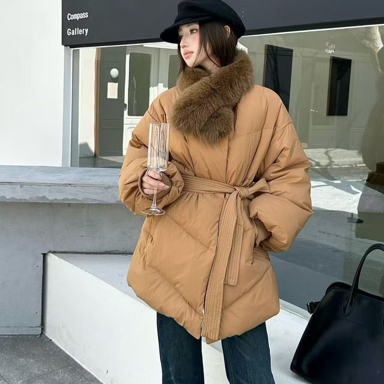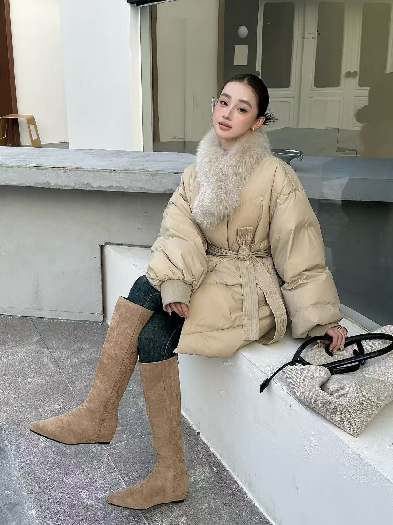 프랑스식 레트로 품격 V넥 루즈핏 레이스업 다운 재킷 여성 화이트 덕 다운 하프 재킷
