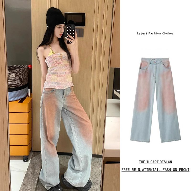 여성 의류 바지 높은 허리 넓은 다리 슬림 와일드 도핑 프랑스OEM 스트레이트 청바지