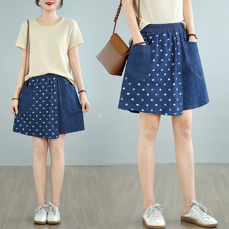 빅 사이즈 바지 여름 뉴 데님 허리밴드 오부 바지 페이크 레이어드 치마바지